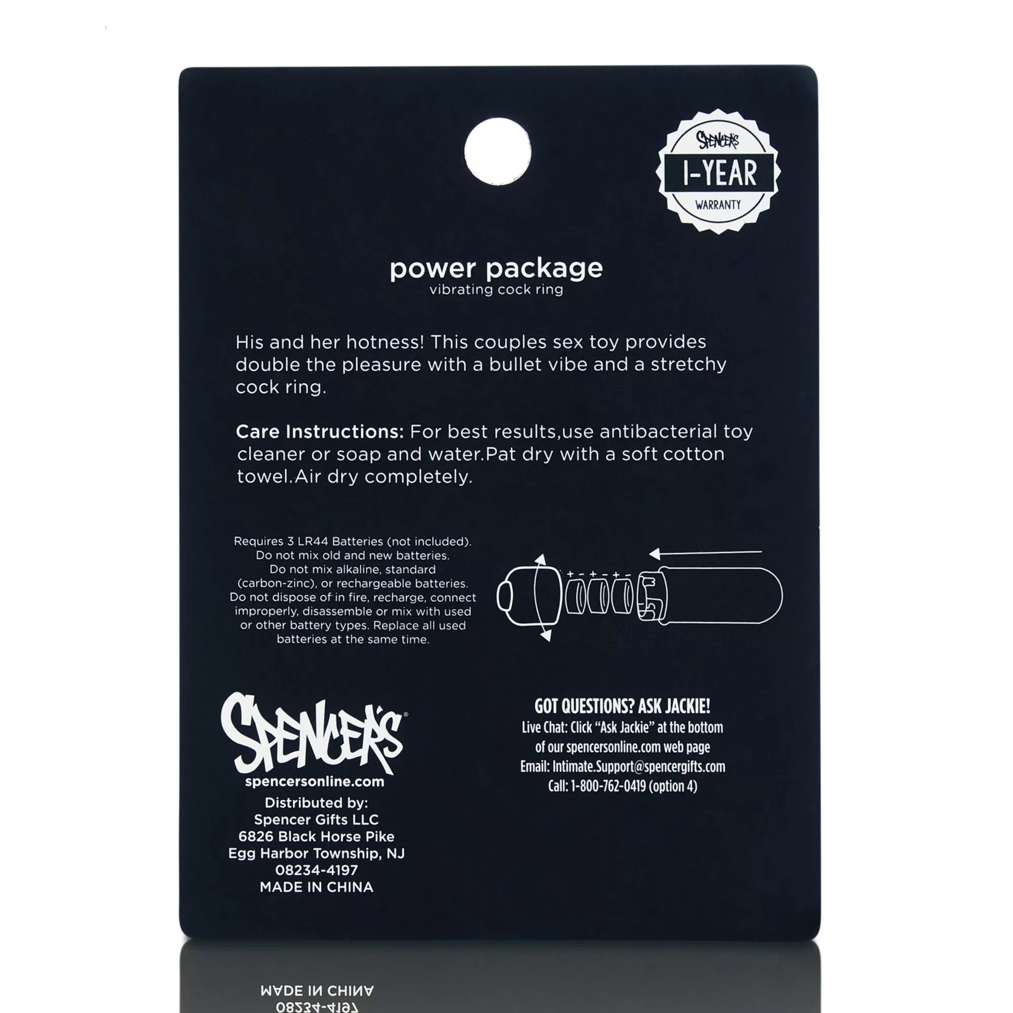 This Power Package Vibrating Cock Ring is designed for you and your partner's satisfaction. With a powerful vibrating bullet and stretchy cock ring, this couples' sex toy is made to please and tease both parties. This bold and black cock ring is perfect for maintaining an erection while pleasing your partner with some clitoral stimulation.