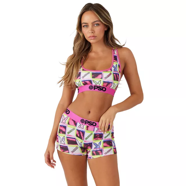 Show off your playful side with this PSD Playboy Bunny Pink Checkered Sports Bra! With its trendy checkered pattern and classic Bunny head logo, this bra offers both style and support.