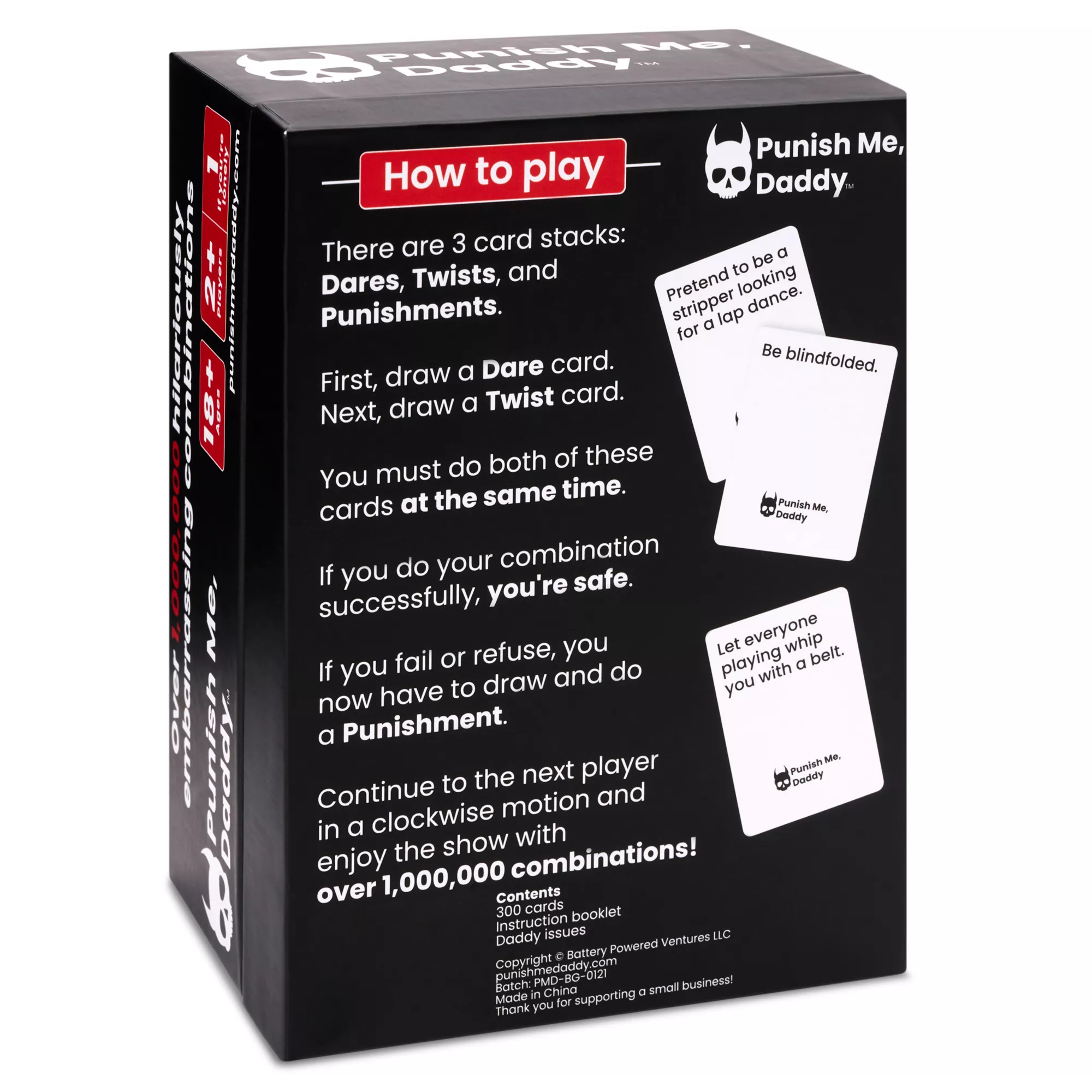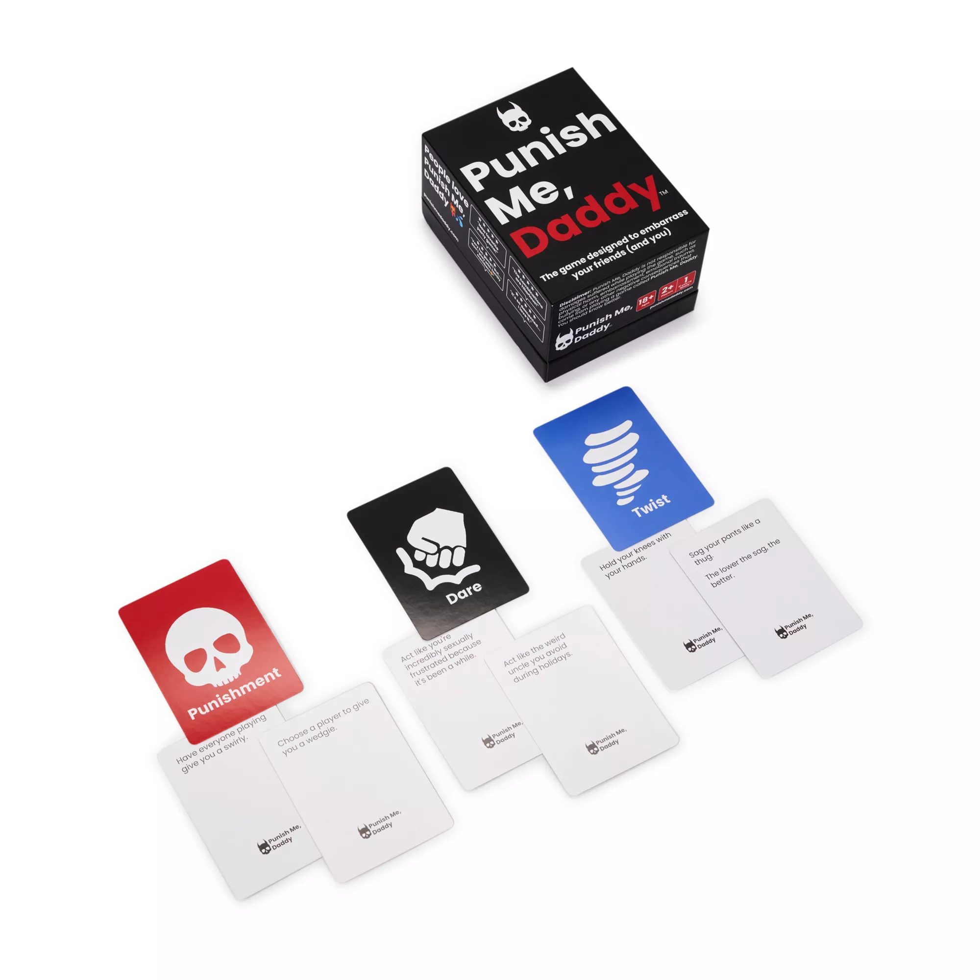 Liven up any party by playing the hilarious Punish Me, Daddy Game! Players have to select dare and twist cards and perform the two actions together. If they fail or refuse, they'll have to draw a punishment card. Get ready for a wild time whenever you break out Punish Me, Daddy! With over 100,000 possible combinations, you'll be sure to find new ways to crack yourselves up every time.