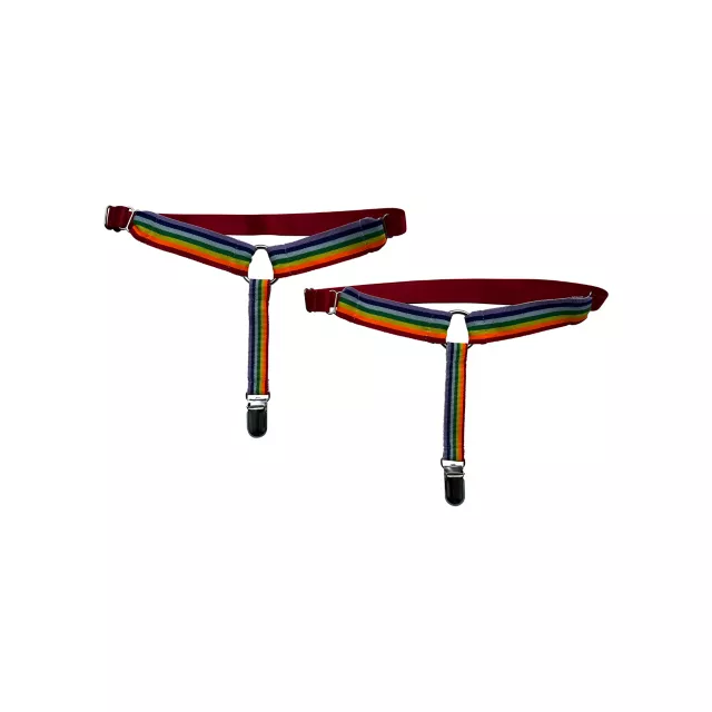 Show off your pride with style with these rainbow pride leg garters with o ring! They're sure to add a sexy spin to any outfit.