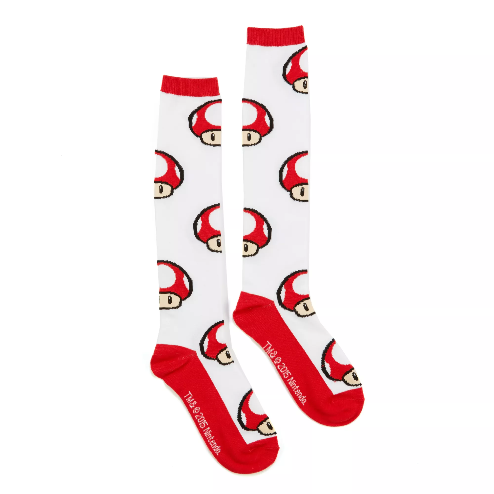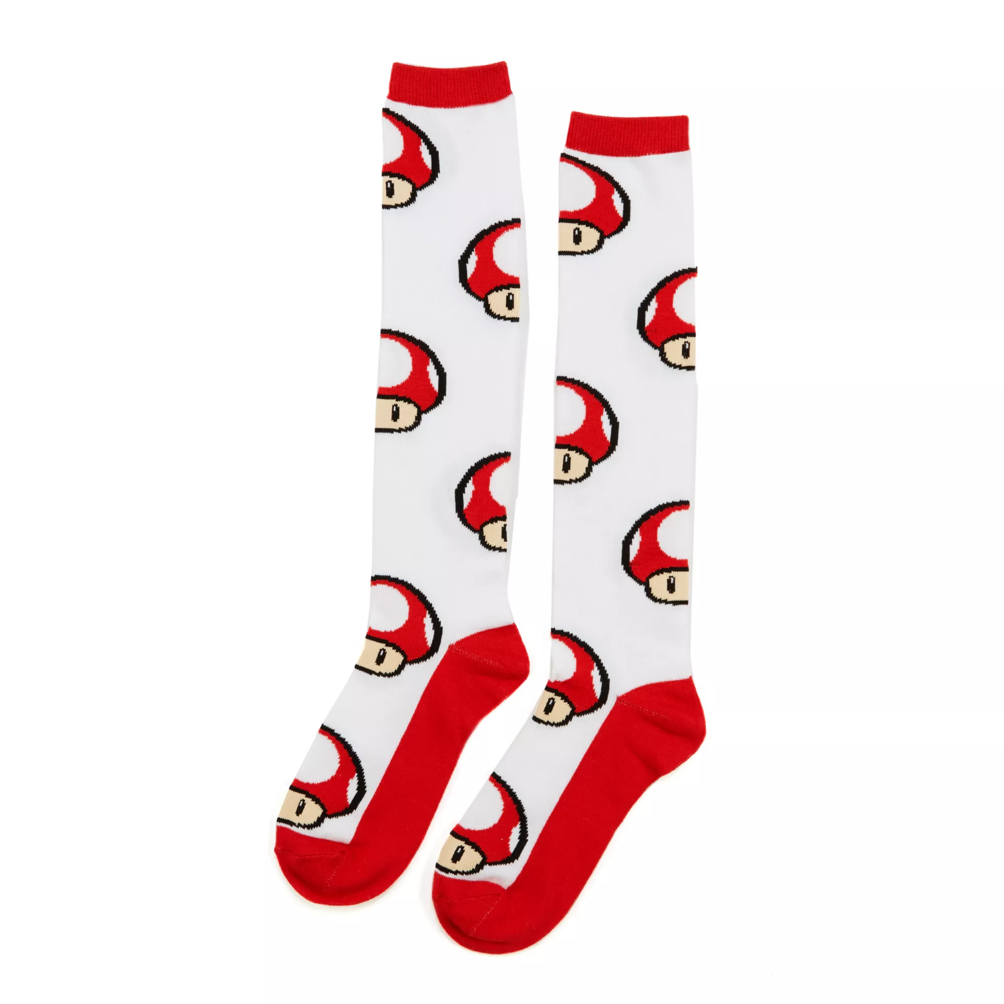 Speed up your step with these officially licensed Mario Bros. Red Mushroom Knee High Socks! These white socks feature the signature red and white capped mushroom featured in the Mario games that give Mario and his friends extra powers!