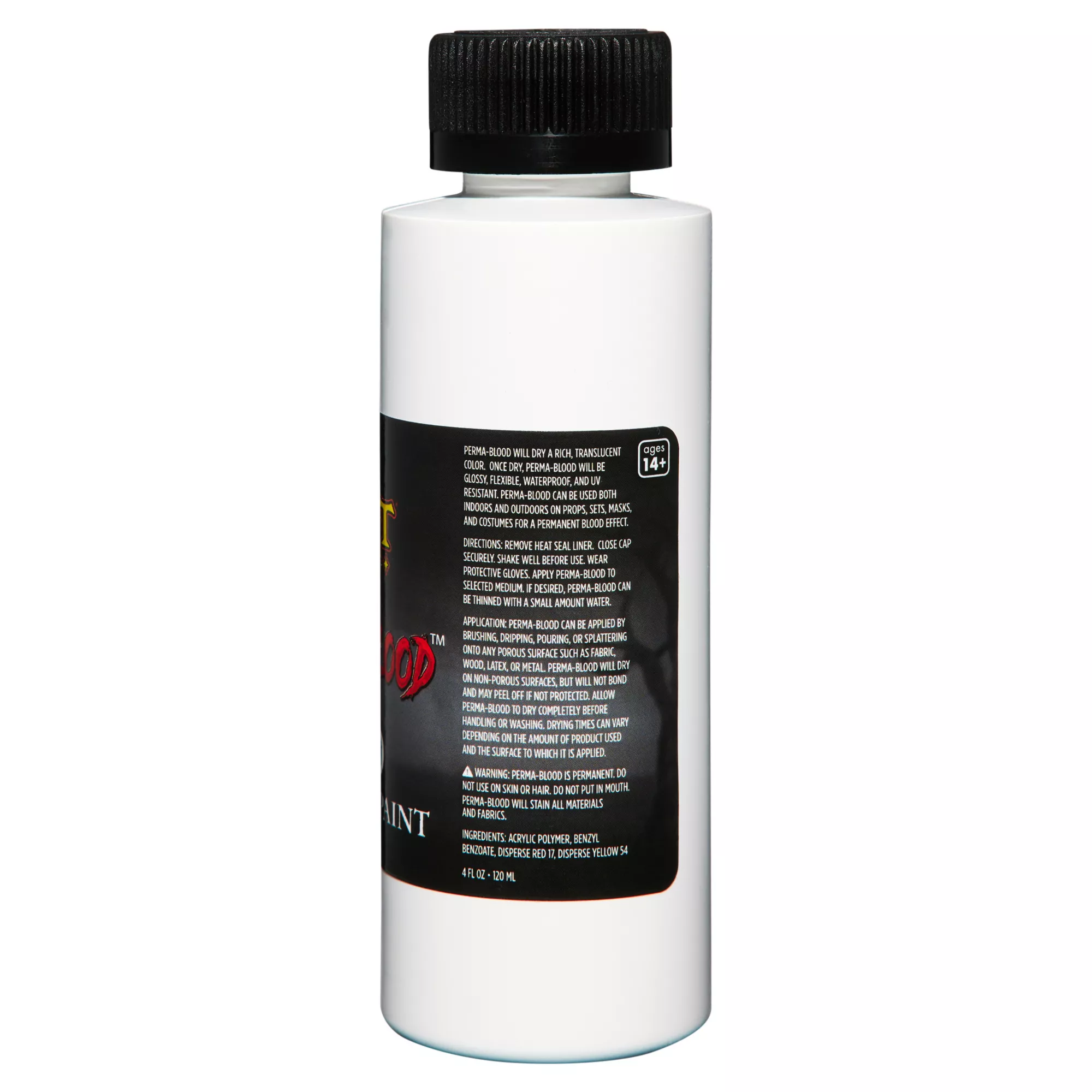 Decorate any surface this Halloween to fit right in with any haunted house theme with this bottle of Red Permablood. Works on fabric, wood, latex, or metal surfaces.