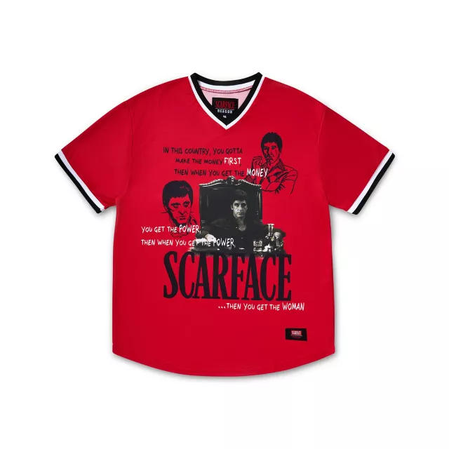 Get ready to feel powerful in this officially licensed Scarface Soccer Jersey. This red jersey features quotes from the movie and is perfect for any Scarface fan.