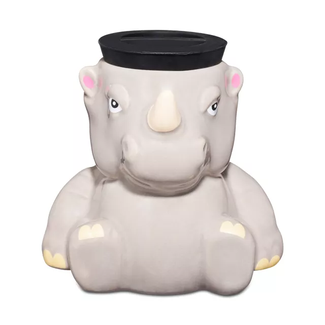 Store your valuables in an unexpected place! This gray ceramic rhino features a tight lid, making it an adorable tabletop decoration and a convenient place to keep your stuff.