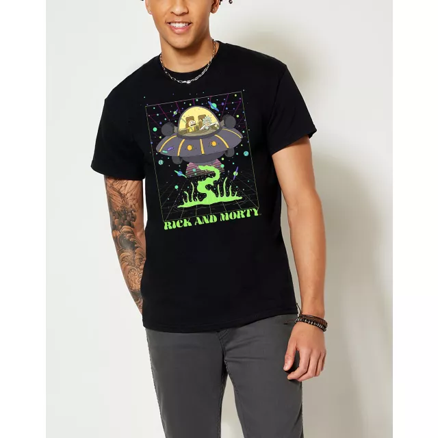 Beam them up! Show off your Rick and Morty fandom with this funny graphic tee. What could be more hilarious than Rick and Morty in a spaceship? This shirt is sure to get all the laughs.