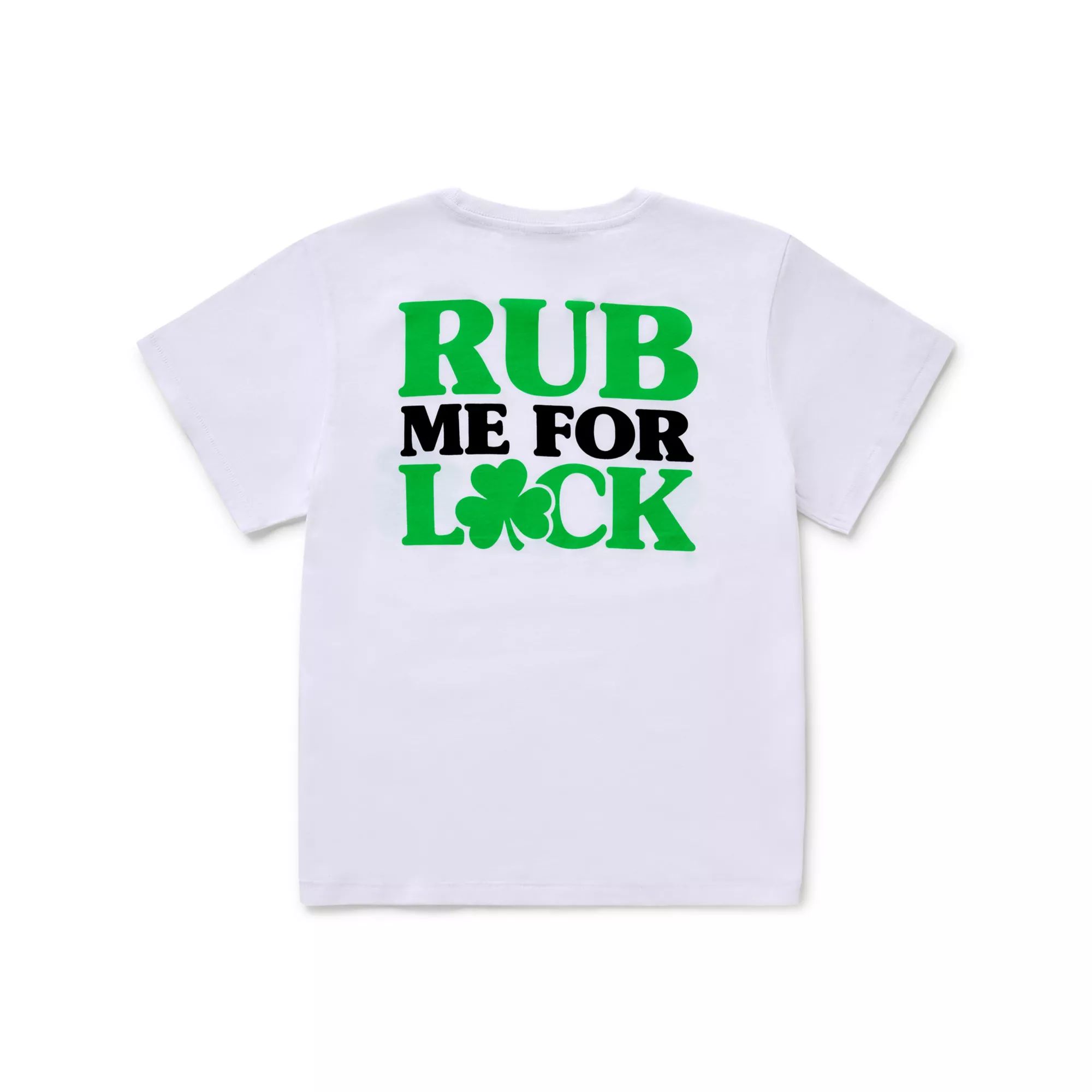 Let the good times roll this St. Patrick's Day in this festive Rub Me for Luck t shirt. With a sexy pair of shamrocks on the front and "Rub Me for Luck" printed on the back, this white tee is perfect for celebrating St. Pat's in style.