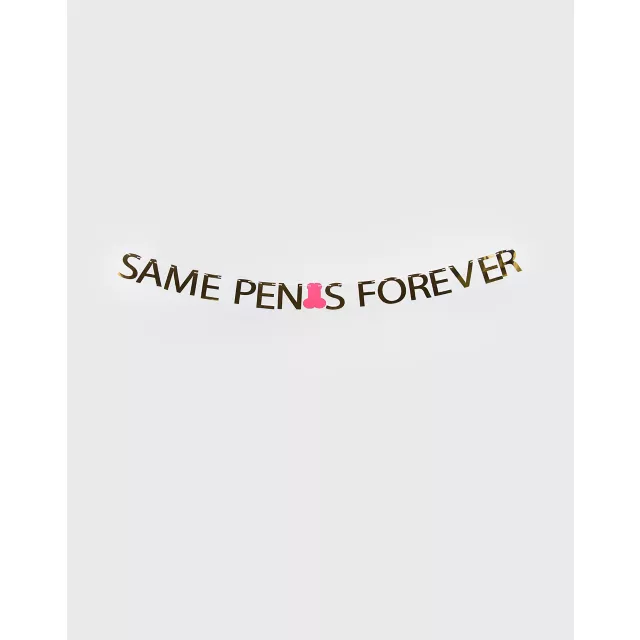 Celebrate her bachelorette party in style with this fun Same Penis Forever banner! With its gold lettering along with a pink penis for the "i," her BFFs and bridesmaids can show the bride to be how much they love her and how excited they are that she'll soon be a Mrs. who's going to be banging the same guy for the rest of her life!
