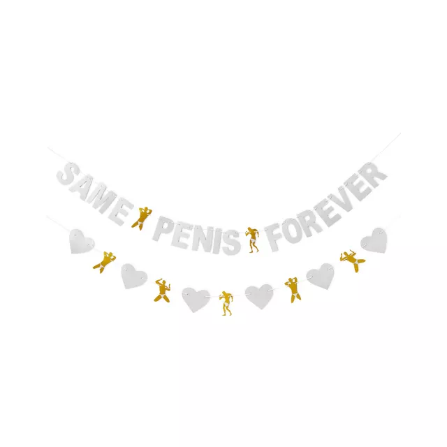 Get ready for your last fling before the ring! Celebrate loving the same partner forever with these Same Penis Forever Banners. This 2-pack banner set features one "Same Penis Forever" banner and one white hearts banner.