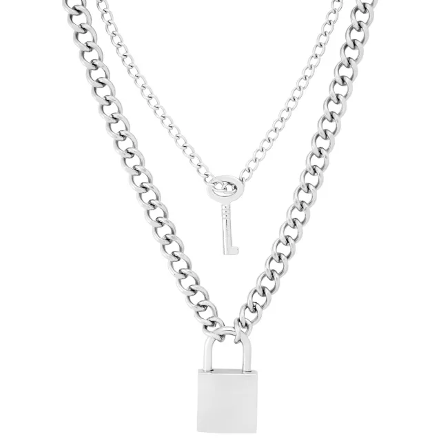 Silver 2-Row Lock and Key Necklace Set