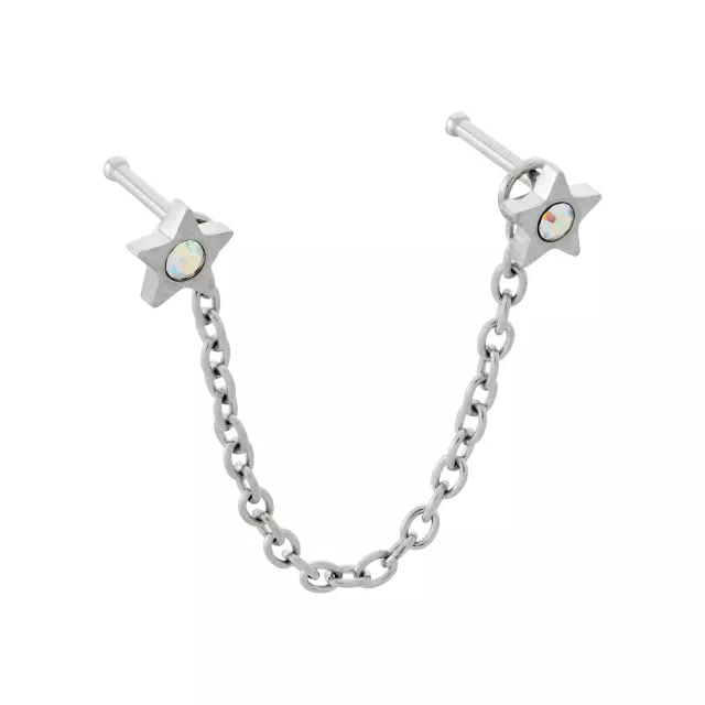 Silver CZ Chained Star Nose Pins - 20 Gauge