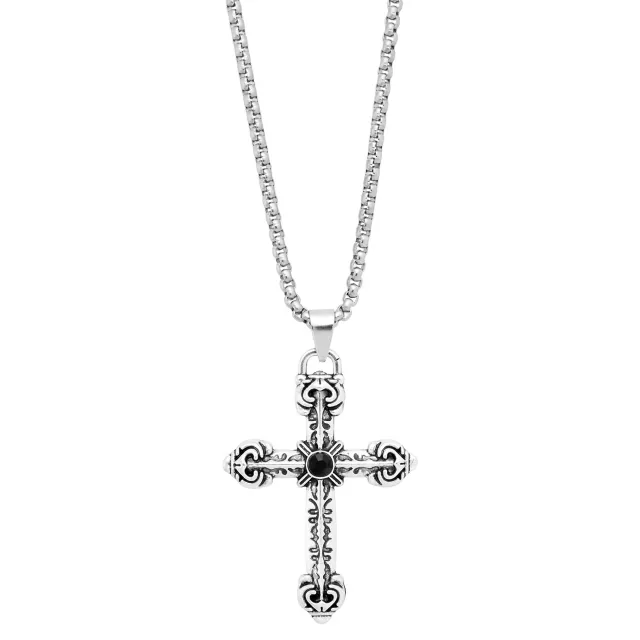 Silverplated Black Stone Cross Pendant Chain Necklace