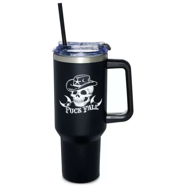 Show off your personality and kiss your thirst goodbye with this 40 oz. skeleton cowboy travel tumbler! With a straw, a sturdy handle, and a playful "fuck y'all" graphic, this tumbler is a must-have.