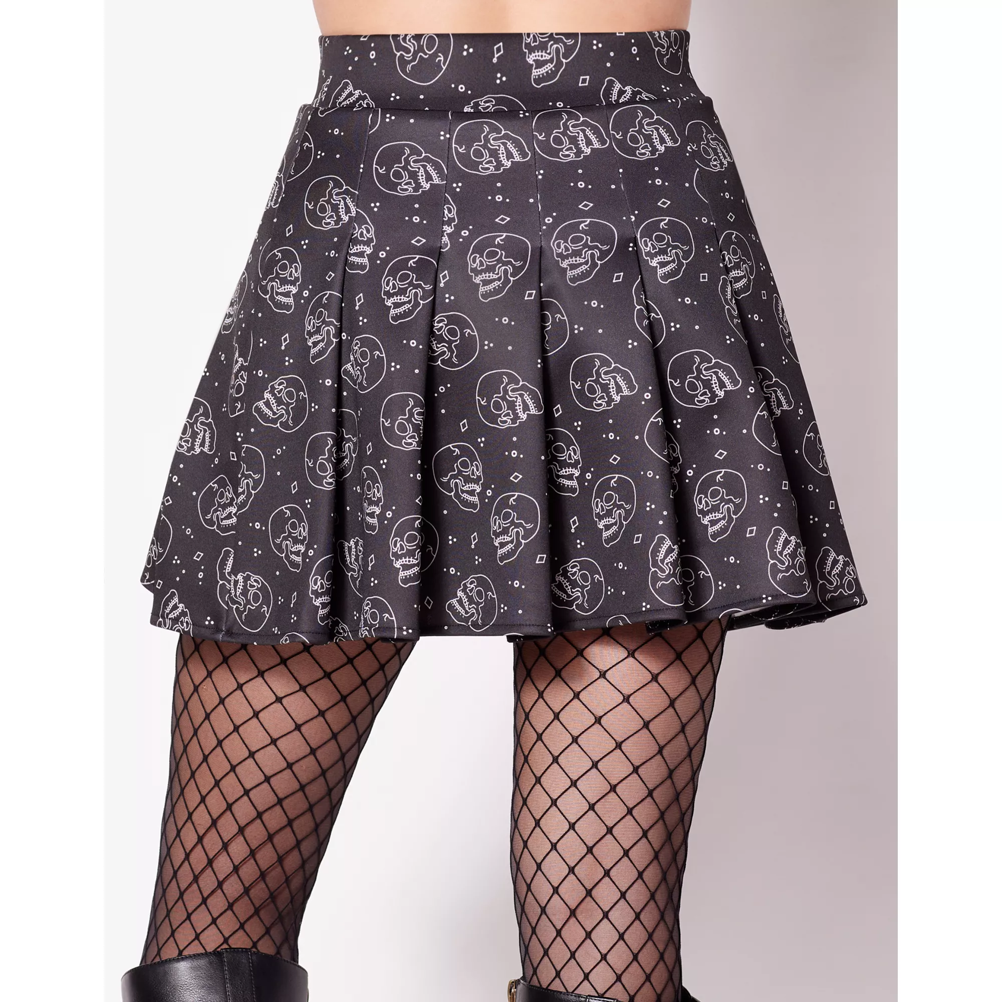 Give some ghostly glamour to your wardrobe when you wear this stylish black skull skirt! You can pair this mini skirt with any top and footwear for an attention-getting look that'll get heads turning.
