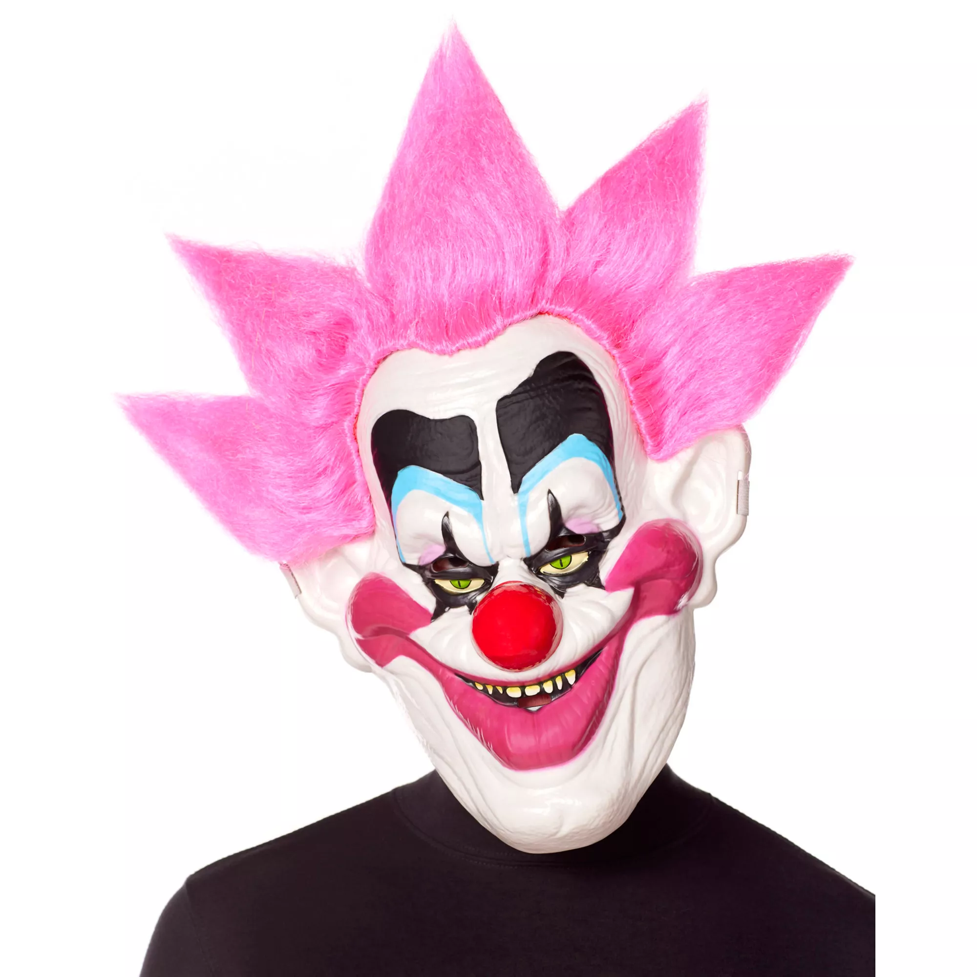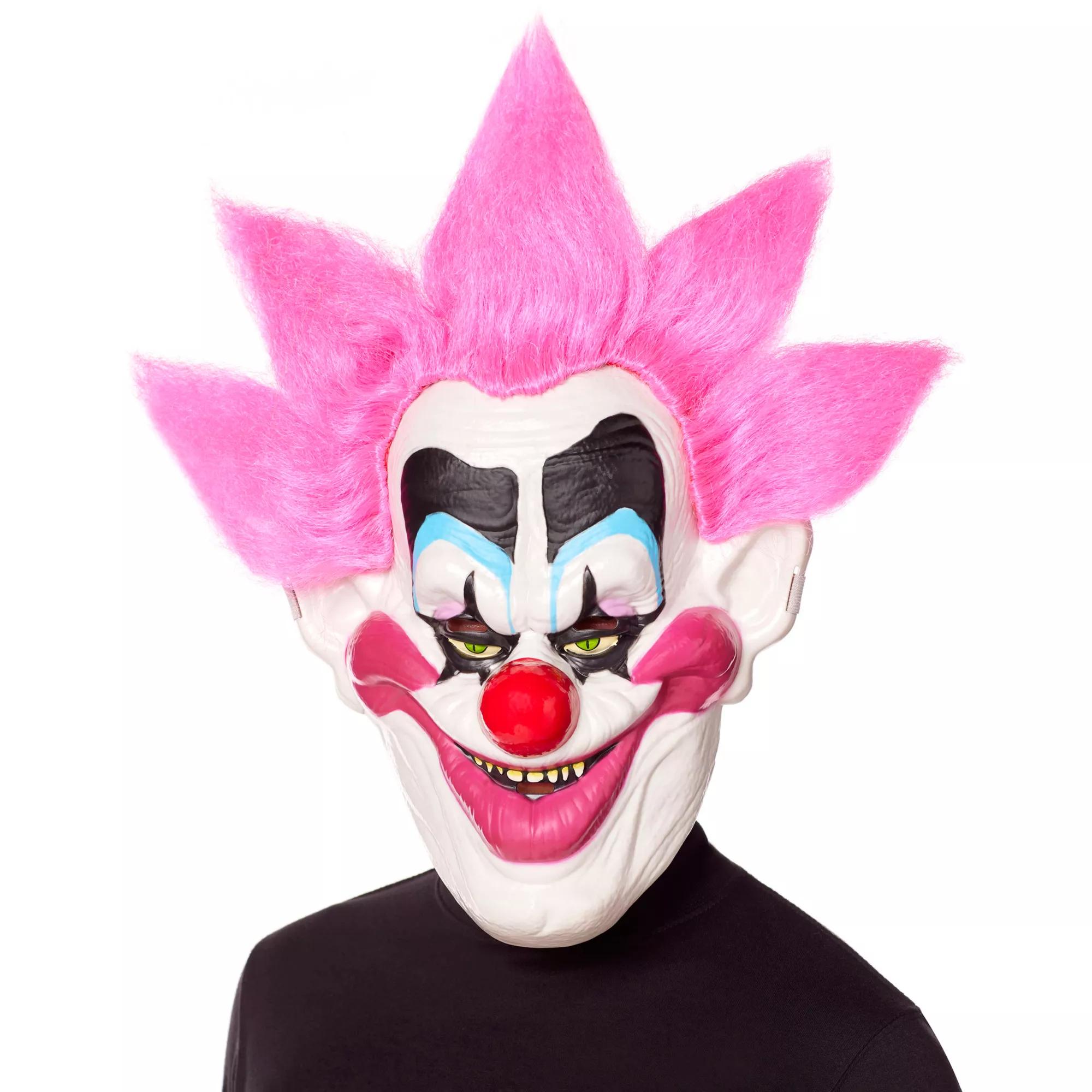Embrace a chilling and thrilling look in this officially licensed Killer Klowns from Outer Space Spikey mask! This spooky Spikey mask features neon pink hair, chalk white skin, and a bright red nose. A wide elastic band keeps this mask securely in place while you clown around.