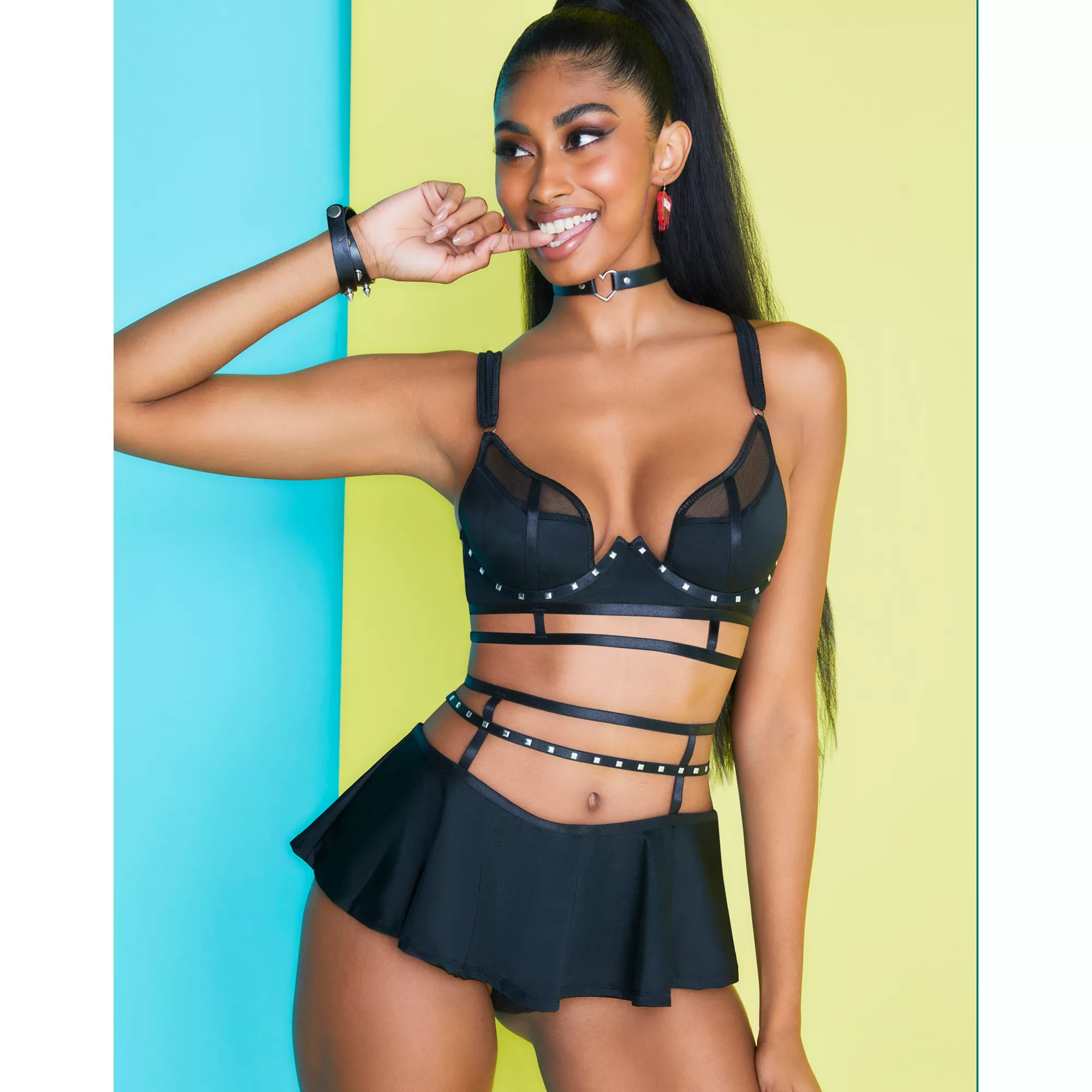 Add major glamour to your intimate attire with this Studded Cage Bralette! This alluring bralette is the perfect sexy lingerie to wear under an outfit or on its own in the bedroom when you want to wow your partner.