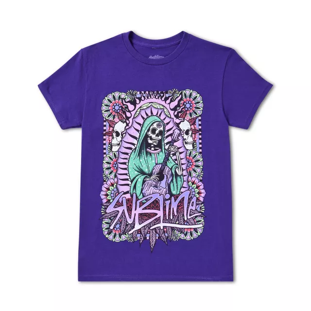 Add a pop of purple to your t shirt collection with this Sublime graphic tee. Featuring stunning details including sugar skulls and flowers, this t shirt is just as beautiful as your favorite Sublime song.