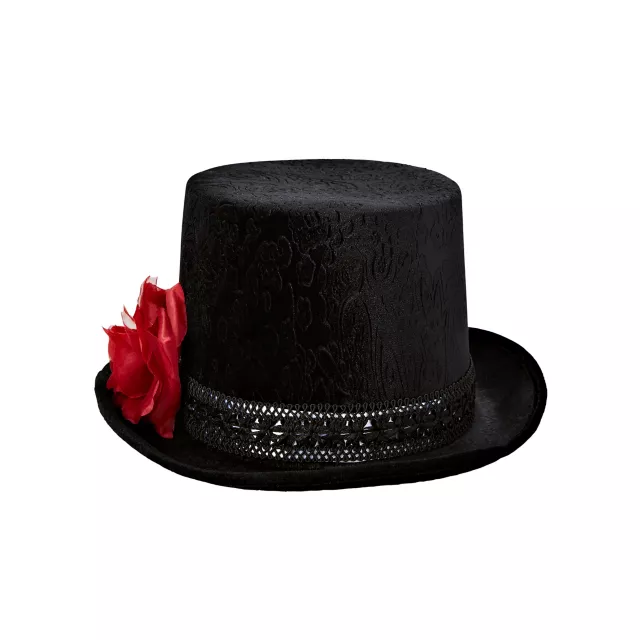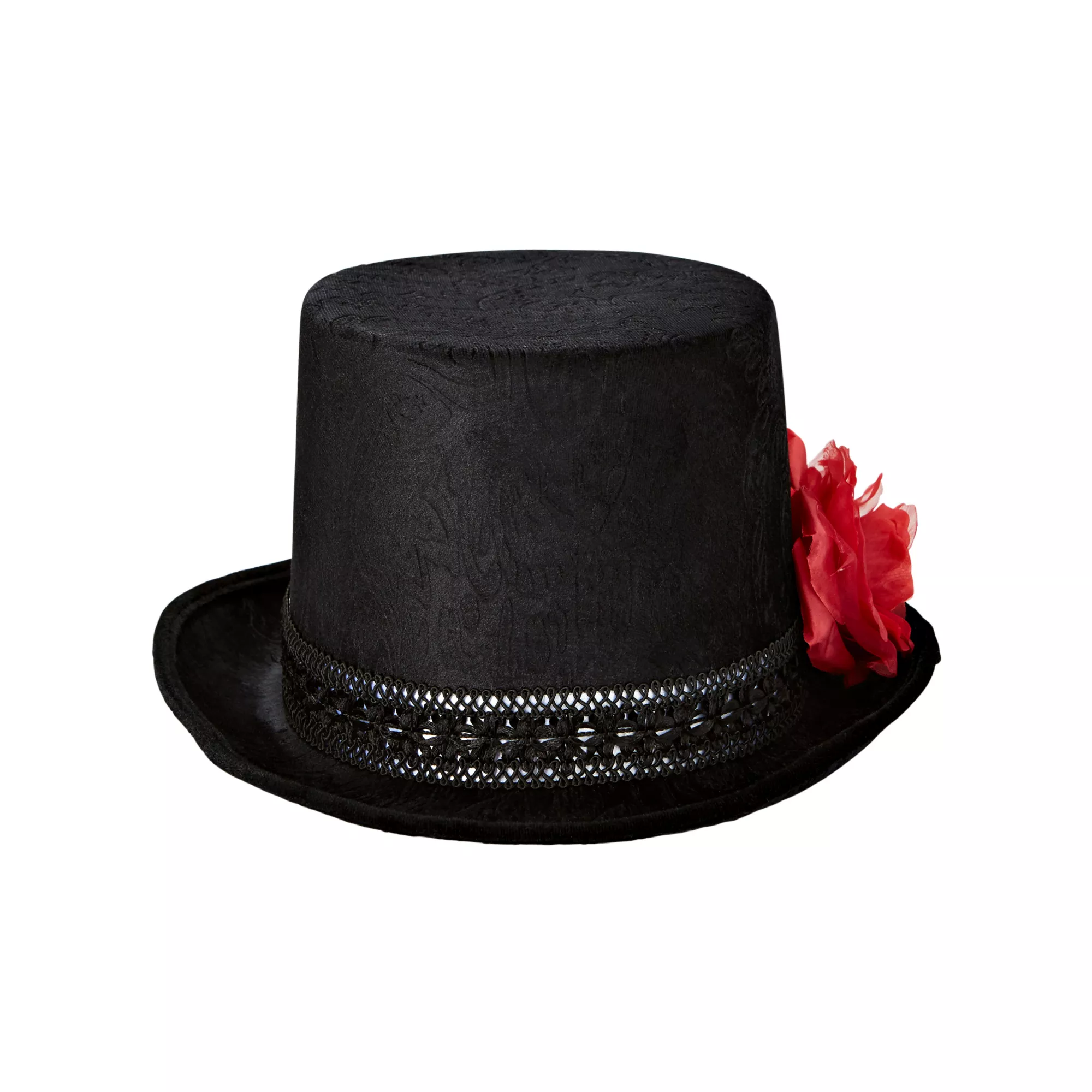 This fashionable hat is the perfect addition to your Halloween costume. With a textured design, a beautiful red flower and a sugar skull detail, you'll have the most original costume in town!