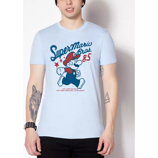 This baby blue graphic tee features the iconic Mario along with the retro-inspired text, "Super Mario Bros 85." Slip into this soft cotton t shirt to show that you're a gamer for life.