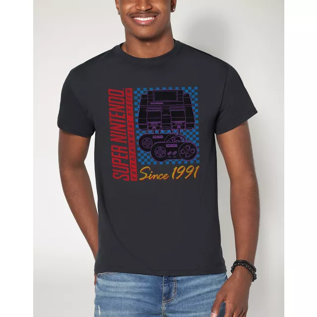 This Super Nintendo graphic tee is dripping with nostalgia. Featuring bold '90s-inspired graphics and an illustration of the beloved Super Nintendo, this black t shirt is retro perfection.