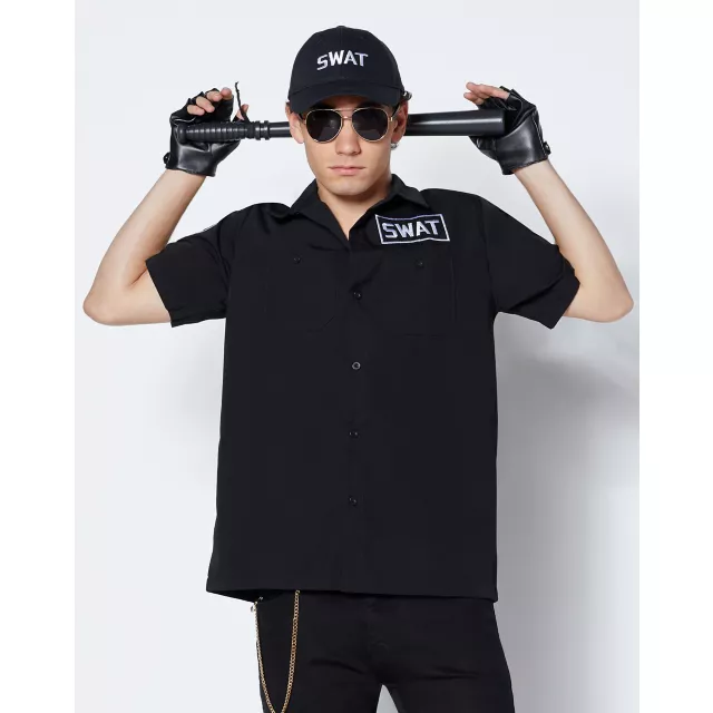 Take on whatever life throws your way when you slip into this button up swat shirt! You'll be ready to take down all of the bad guys! Add the embroidered swat baseball cap, and you'll be in full uniform! The embroidered badge on the sleeve makes the entire outfit official.