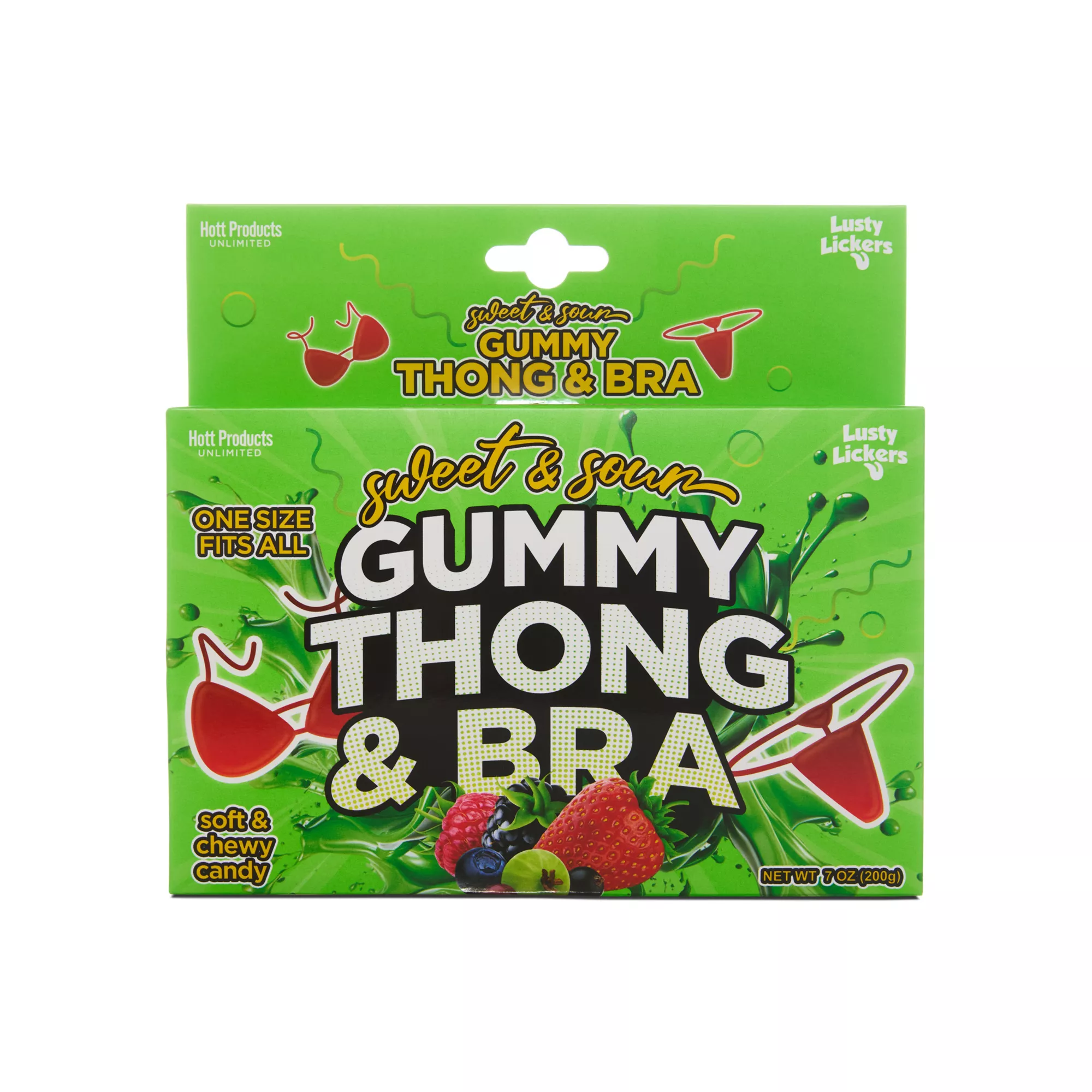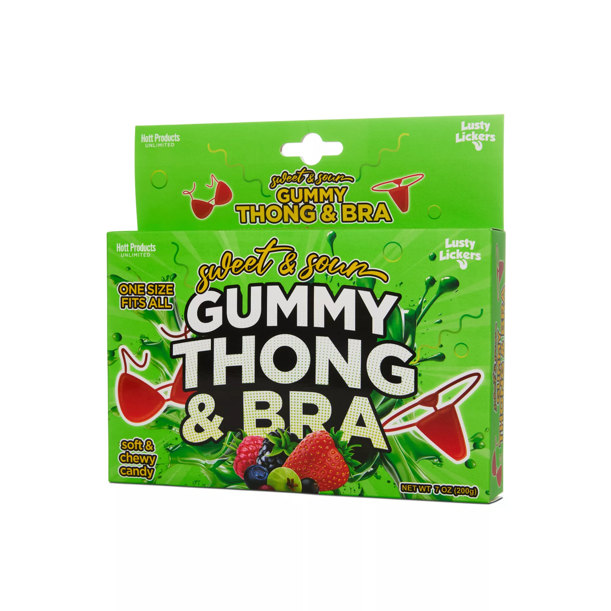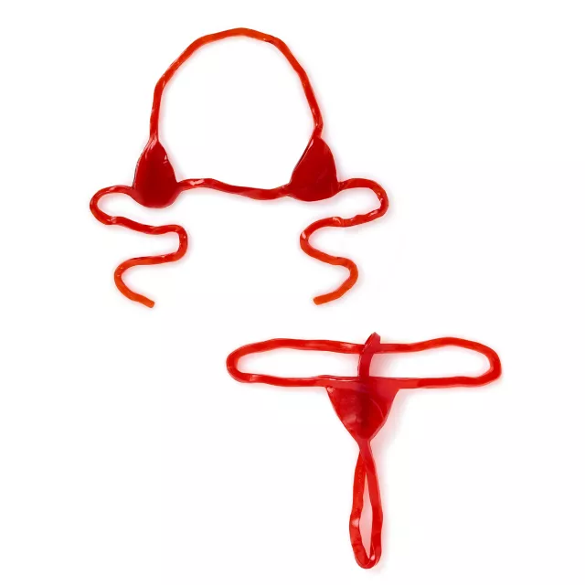 Pull off a bedroom look that's good enough to eat when you don this Sweet & Sour Gummy Thong and Bra! Made with soft and chewy candy, this edible lingerie set is sure to have your partner's mouth watering.