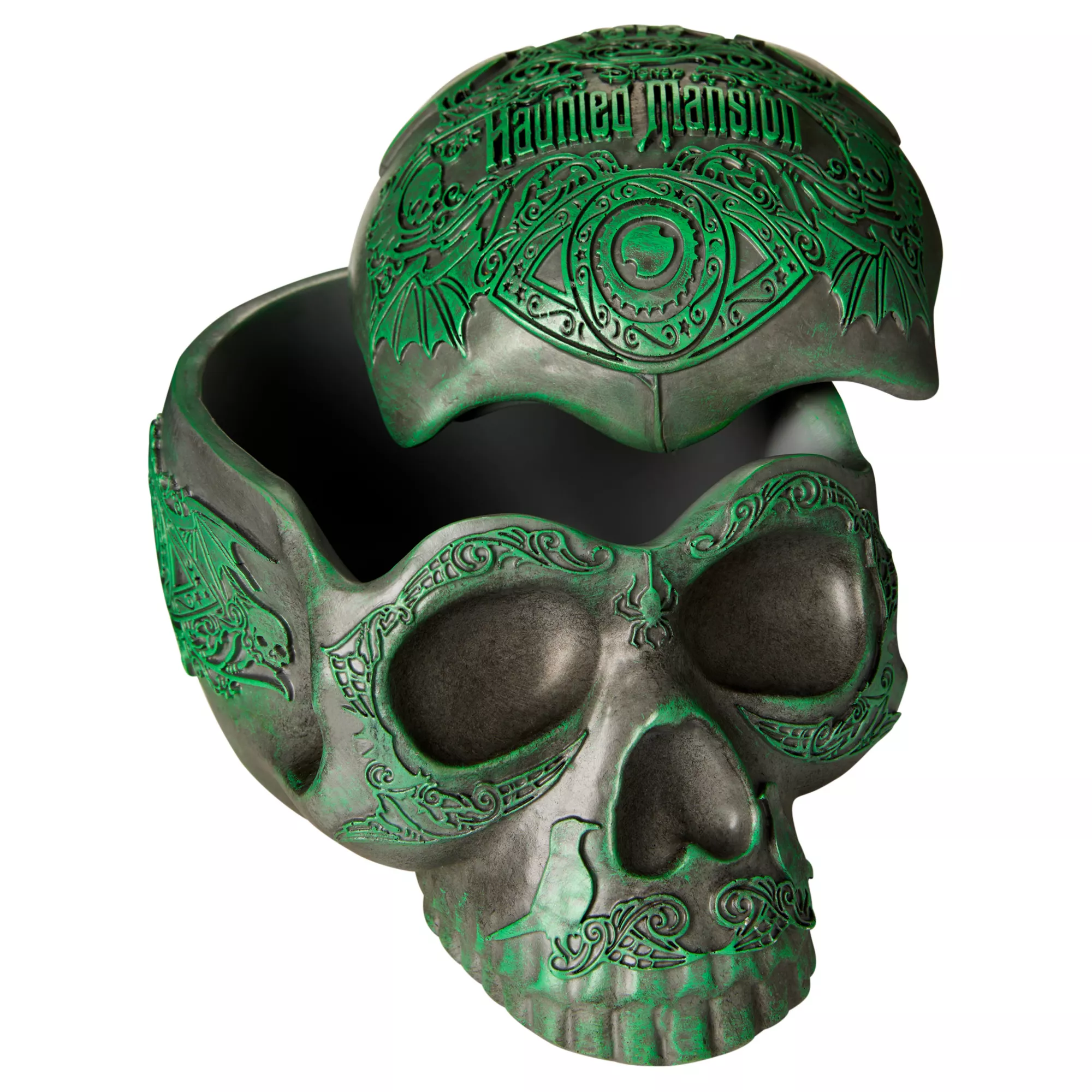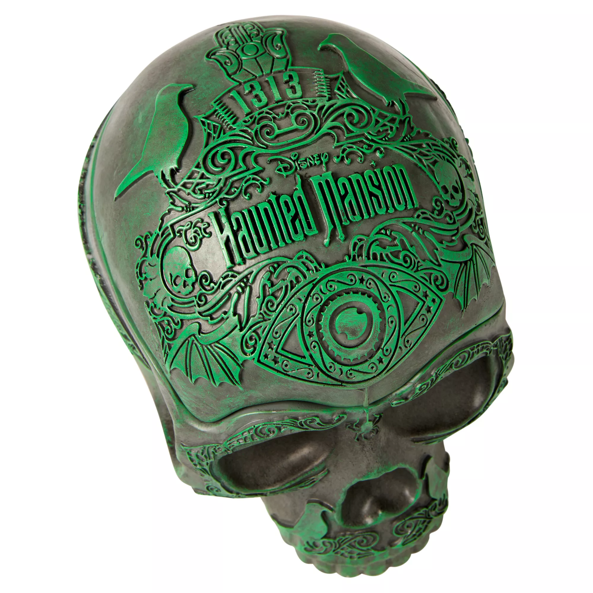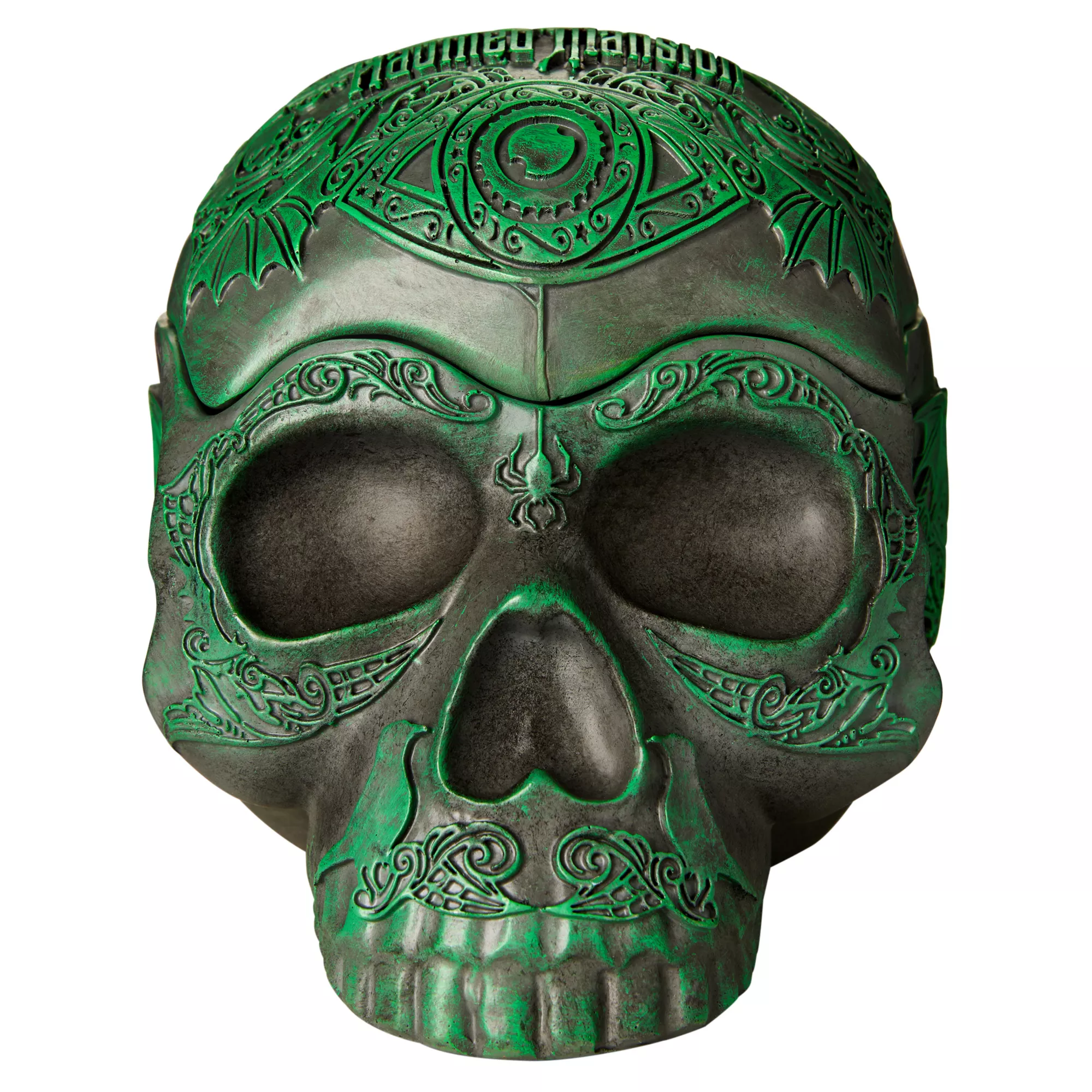 Add the perfect touch of horror to your home with this Disney's The Haunted Mansion skull decoration. With hollow features and a removable top, this spooky centerpiece is sure to spark your guests' curiosity!