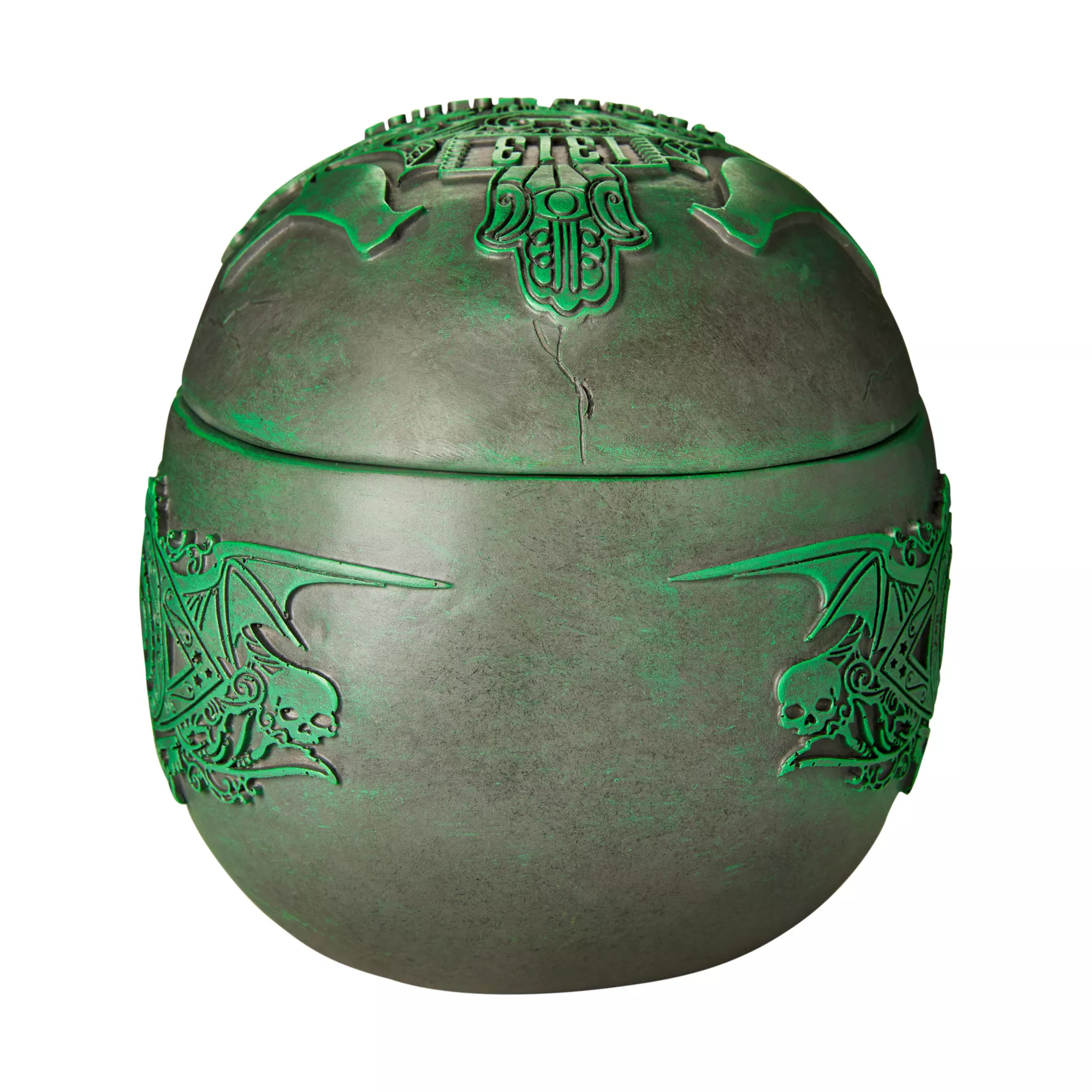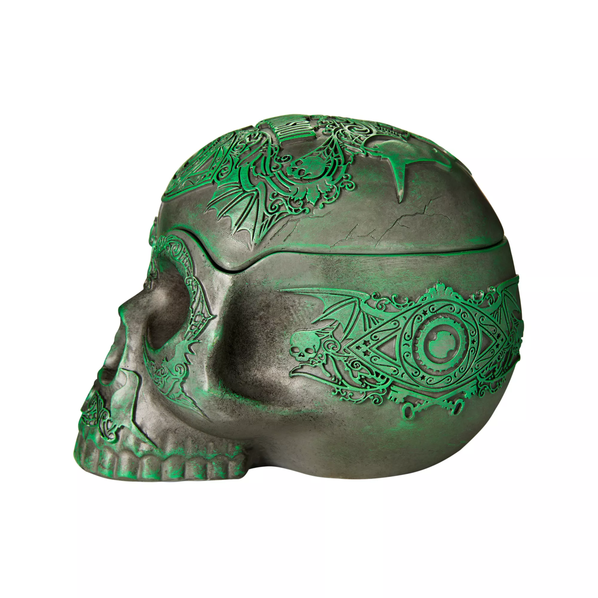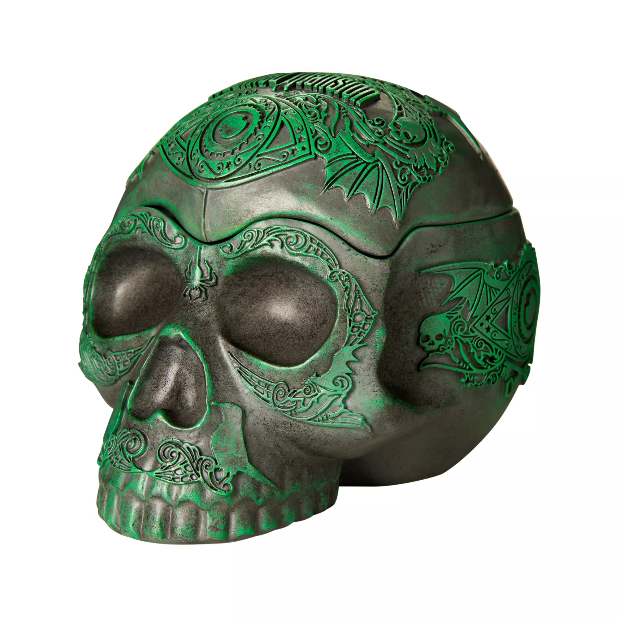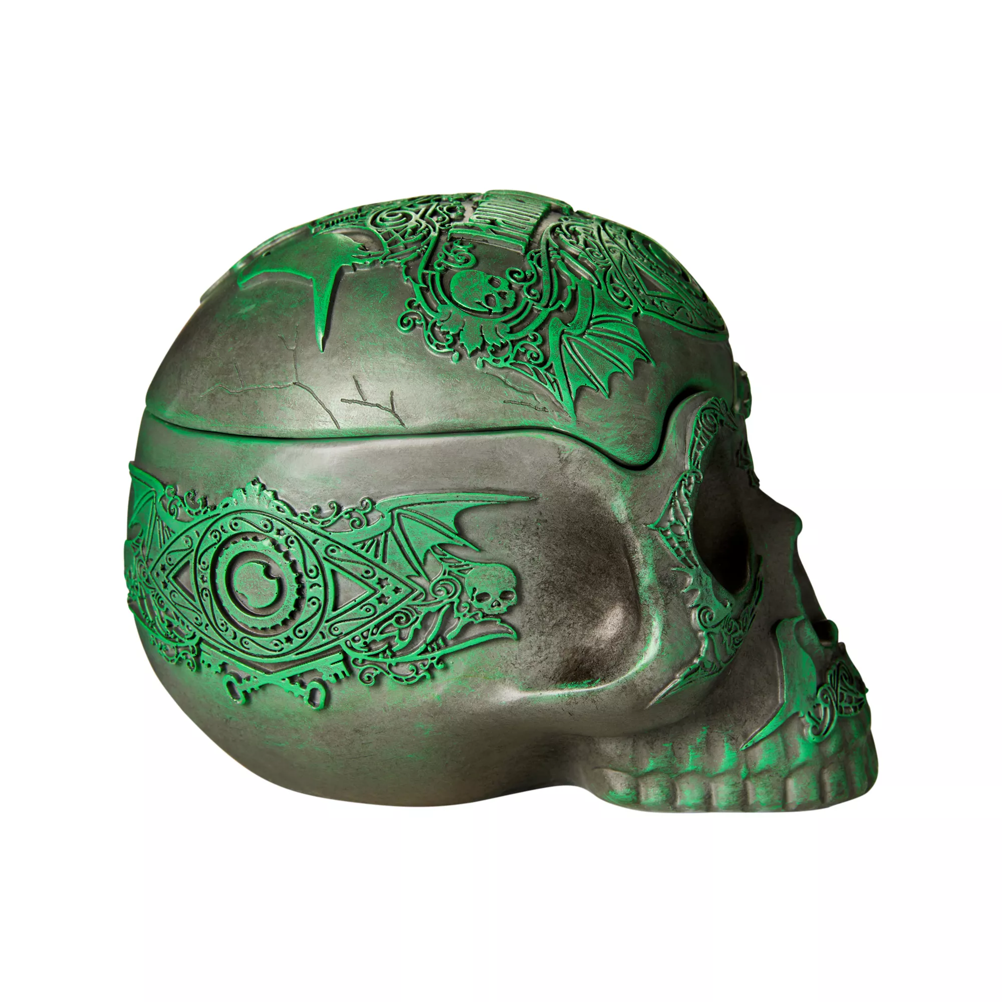 Add the perfect touch of horror to your home with this Disney's The Haunted Mansion skull decoration. With hollow features and a removable top, this spooky centerpiece is sure to spark your guests' curiosity!