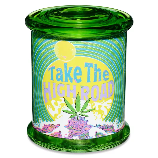 Store your favorite goodies in this Take the High Road stash jar! With its airtight lid, this stash jar will keep your items totally fresh so they're available whenever you want them.