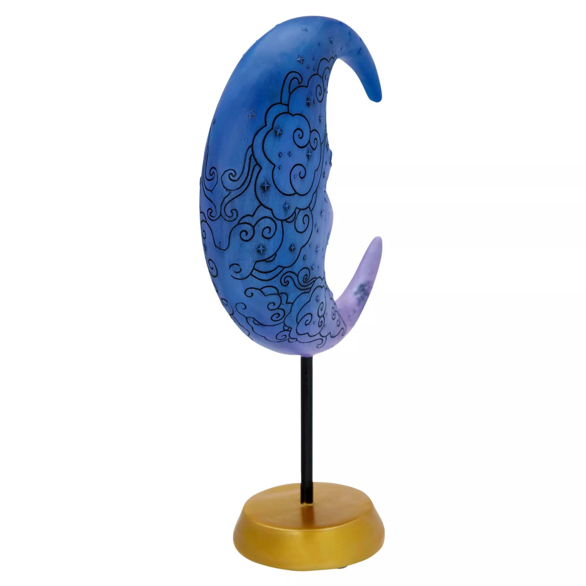 Gaze at the moon whenever you want with this Tarot Blue Moon Tabletop Decoration. This crescent moon decoration features a gold colored base and a thin black stand. The moon's facial profile is relaxed into a gentle smile. Display this blue moon figure wherever you need a little extra magic.