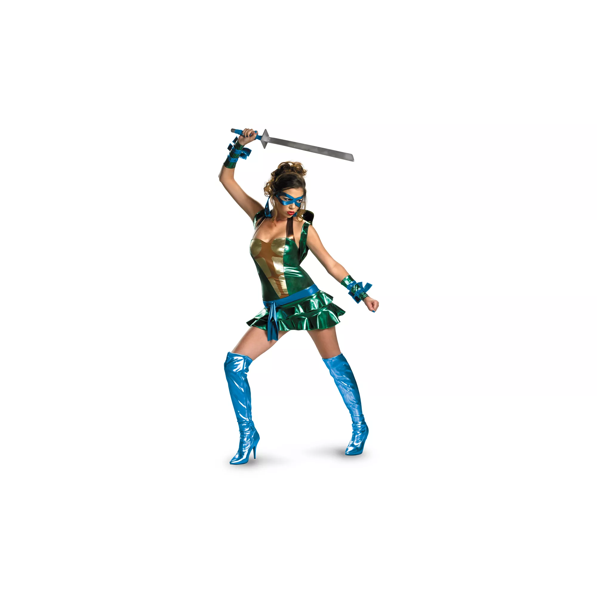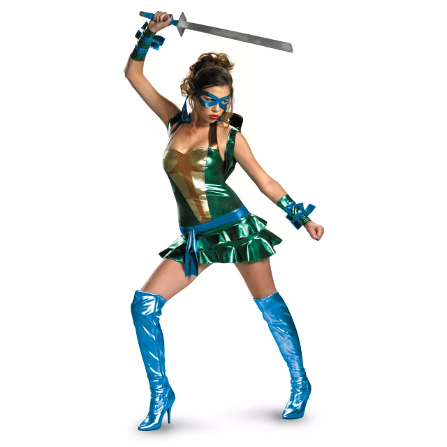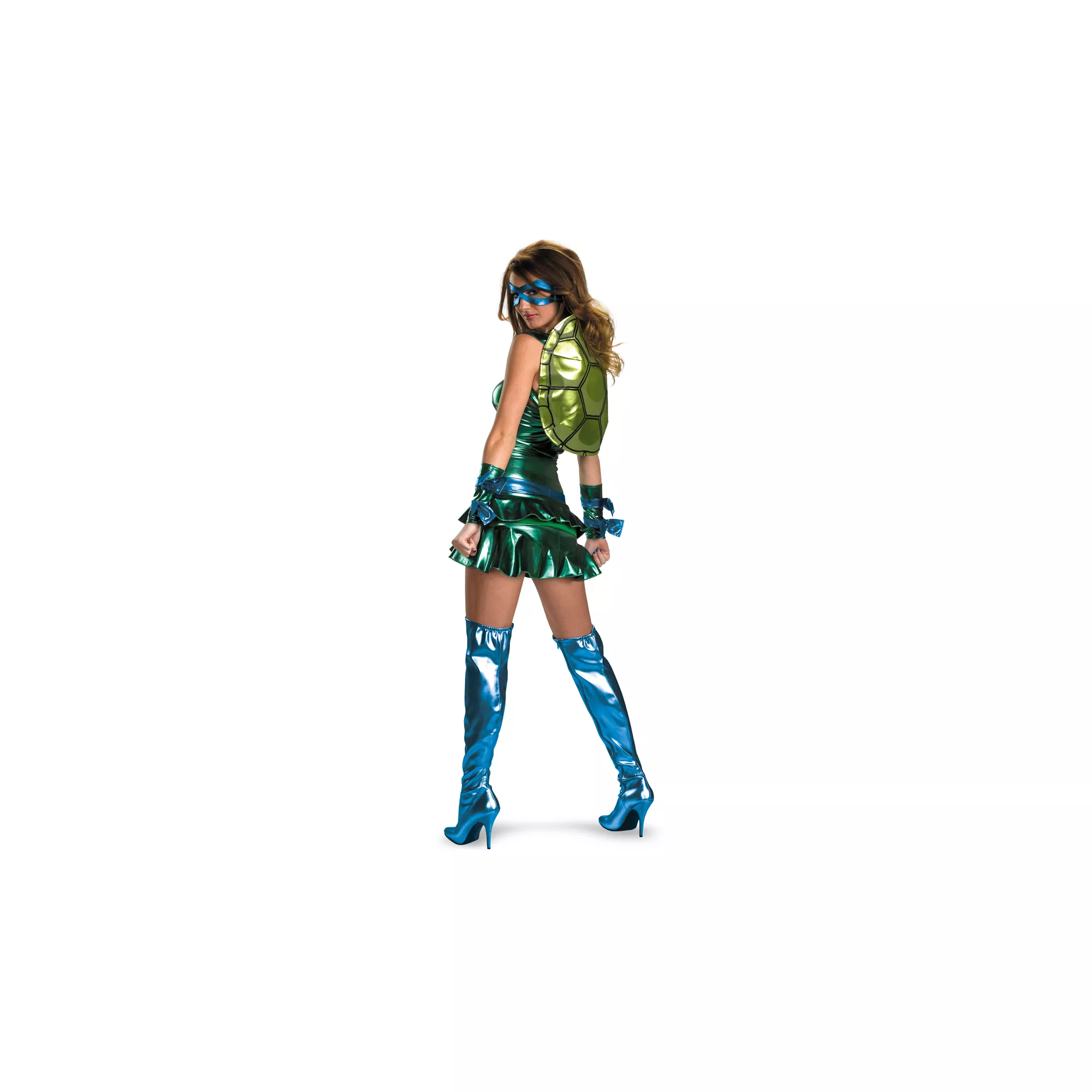 adult womens costume. Work on your martial arts techniques while wearing the green dress, complete with turtle shell backpack, matching wristbands and eye mask.