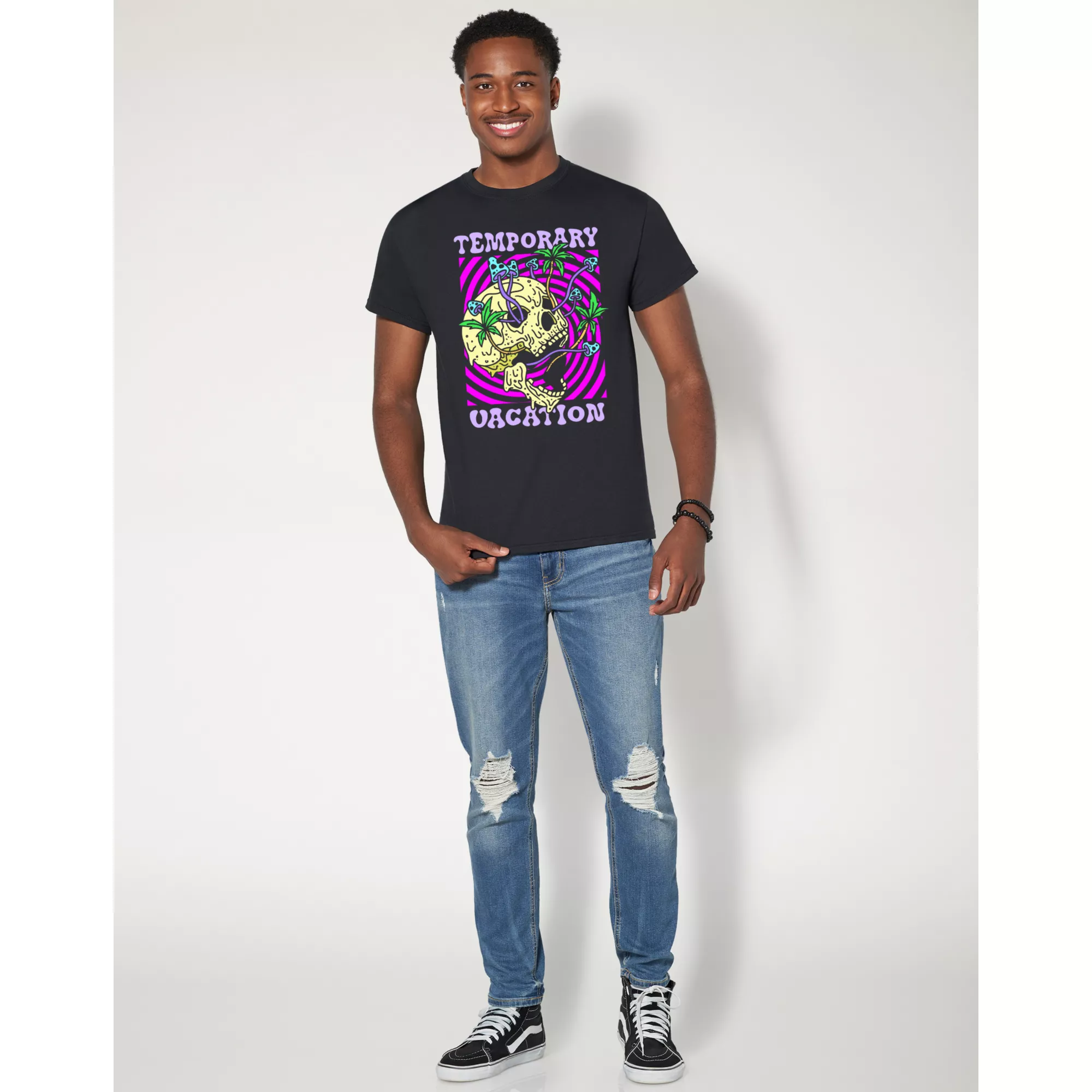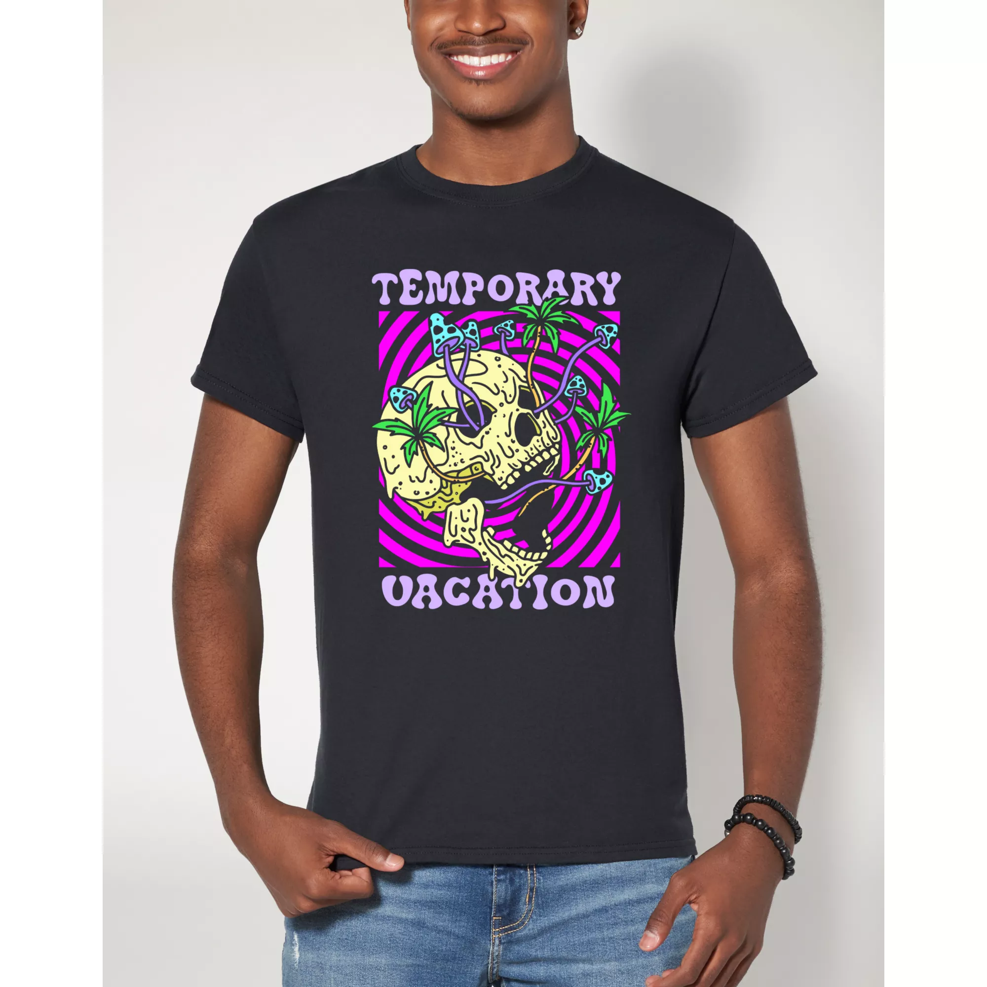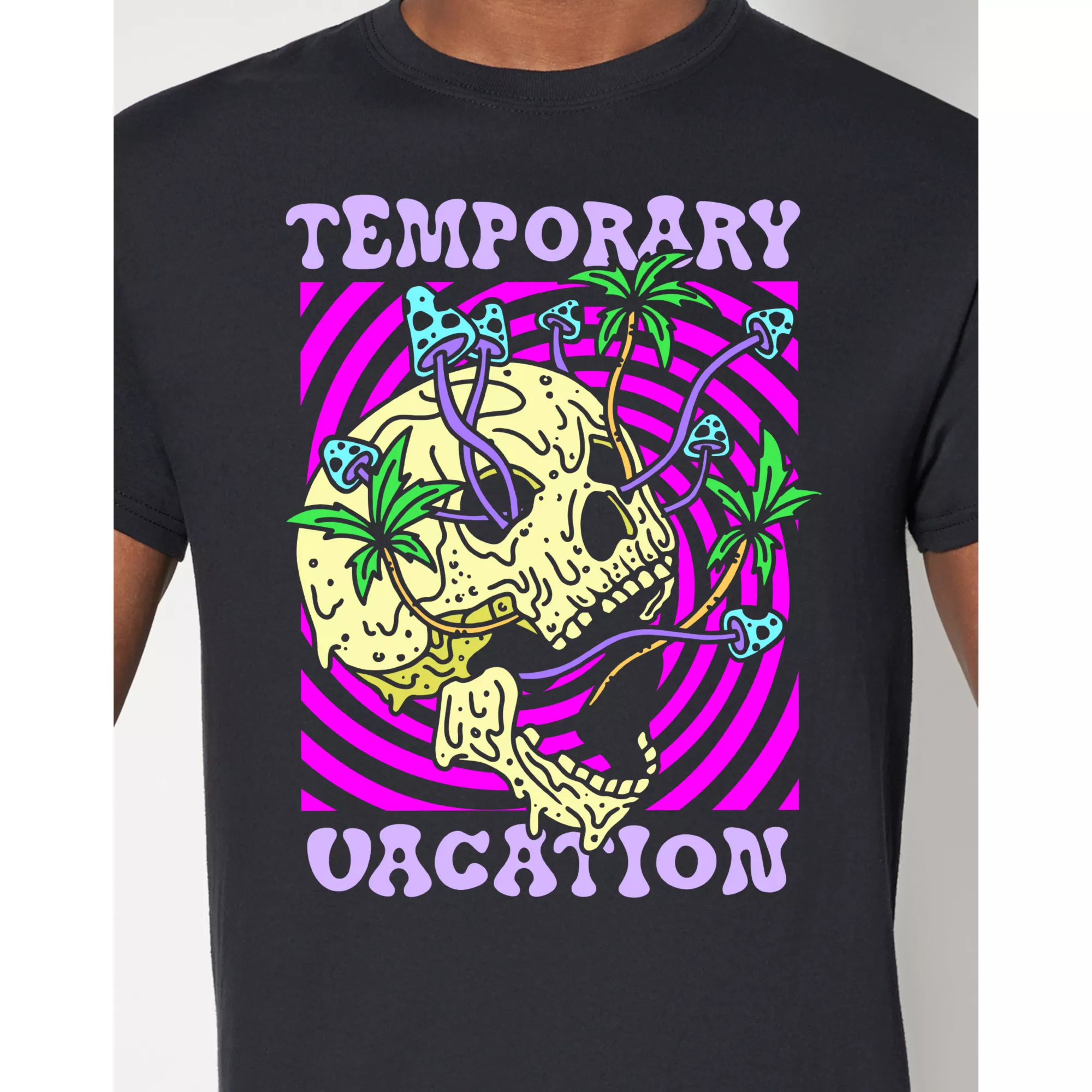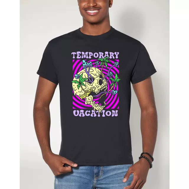 Take a trip in this Temporary Vacation T Shirt. Featuring a trippy magenta spiral, a mushroom-filled skull, and bold lettering, this colorful t shirt is a must-have for your next adventure.