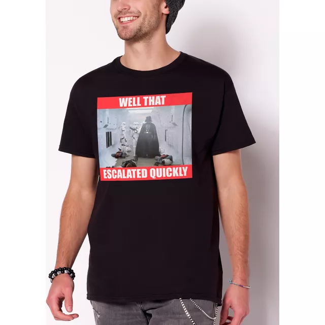Wear one of the most iconic Star Wars scenes featuring Darth Vader! This black graphic tee features the classic scene from Star Wars Episode IV - A New Hope along with the phrase, "well that escalated quickly."