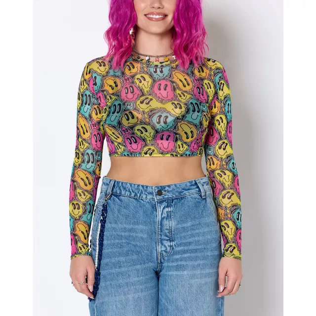 Embody the psychedelic-chic aesthetic this season when you rock this Trippy Smiley Face Mesh Crop Top! Its curve-hugging fit, soft mesh, and vibrant yellow, turquoise, and pink hues make it an absolute must for your next rave, festival, or spring fling event.