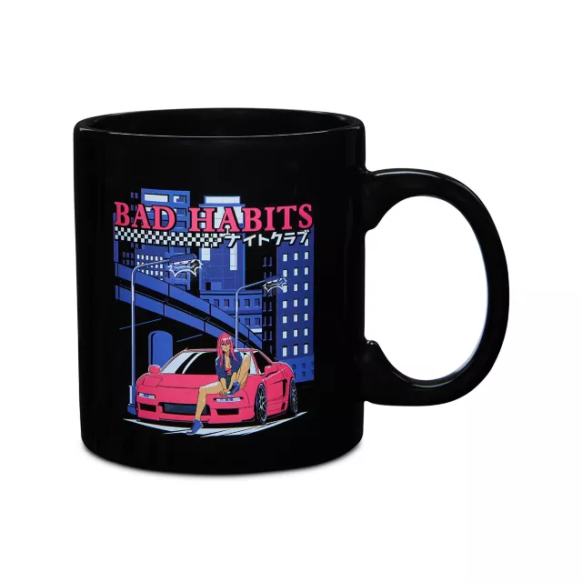 Start your day with a little edge thanks to this Bad Habits Coffee Mug. Featuring a bold graphic of a red sports car and a neon pink and purple cityscape, this mug fuels your vibe no matter what time of day it is!