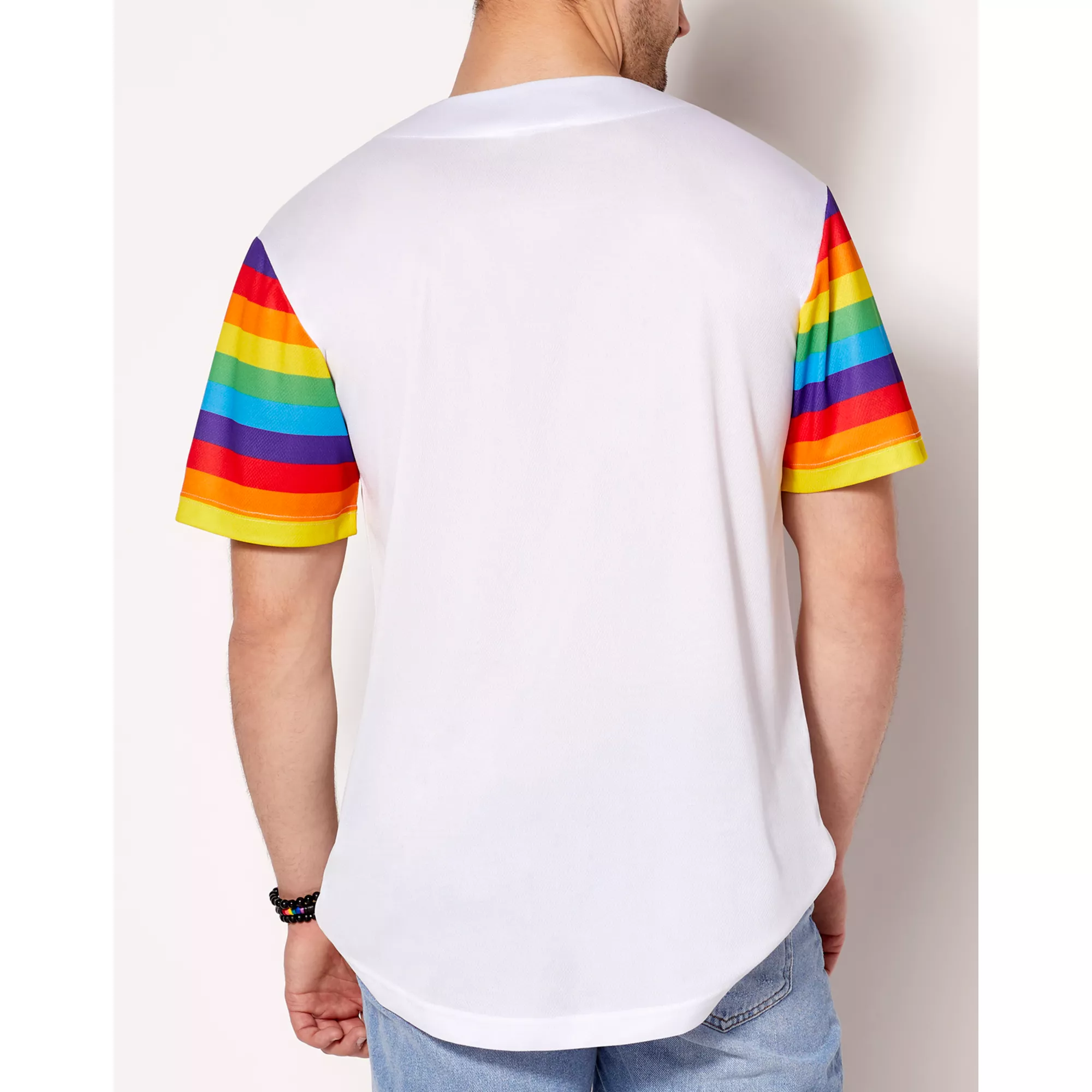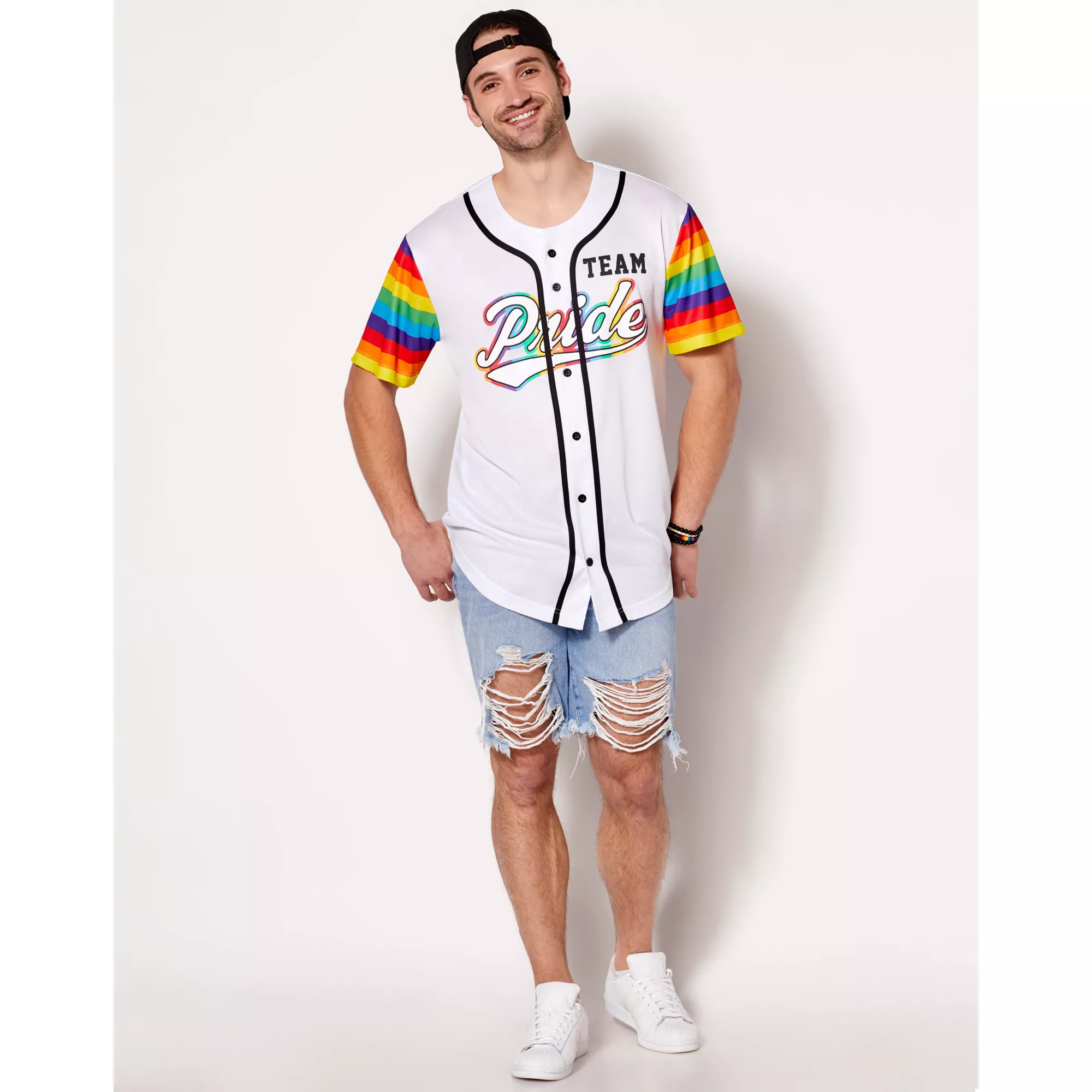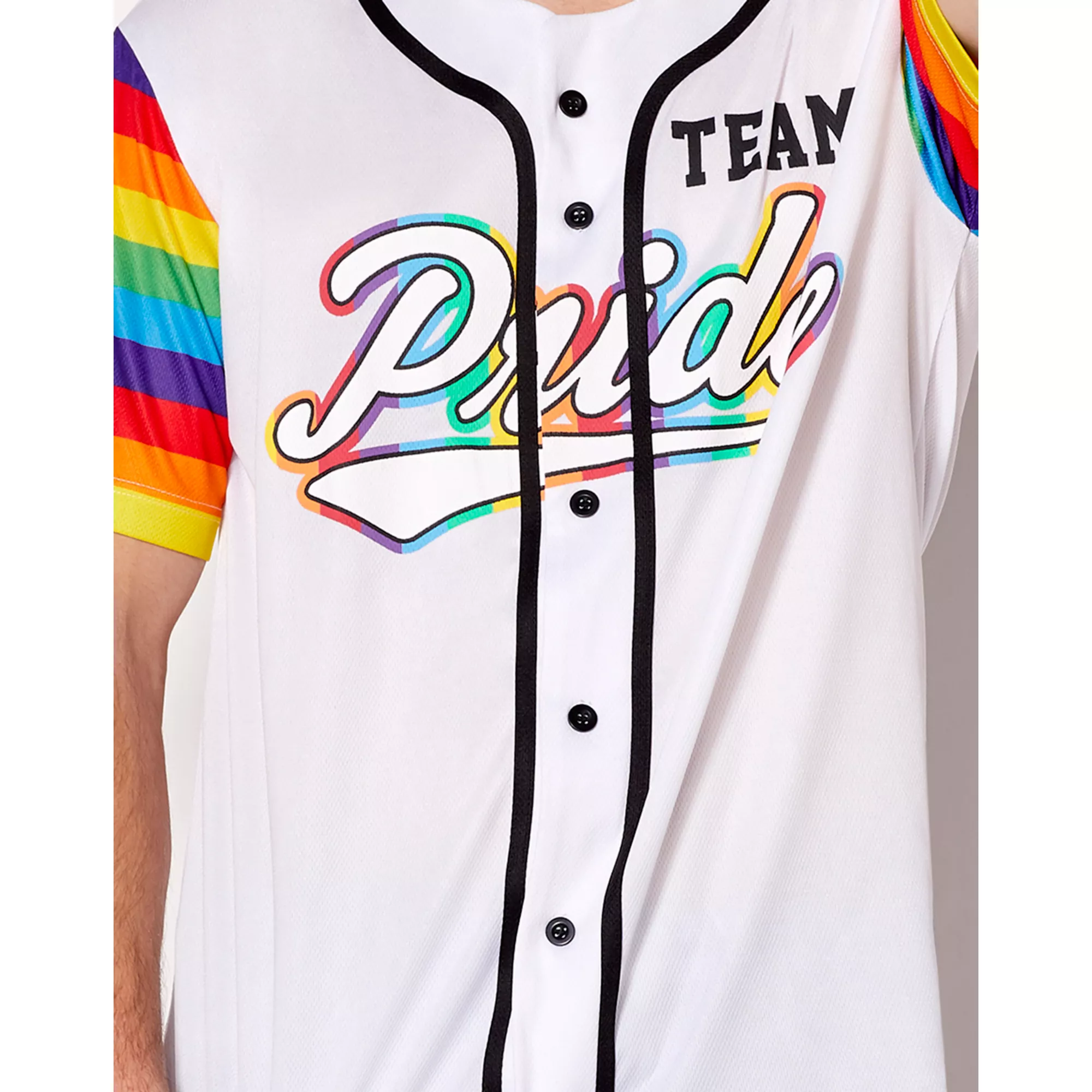 Add this stylish Team Pride Jersey to your collection and everyone will know that you support team pride. This pride jersey is the perfect choice for any LGBTQ+ members attending any pride events like a rally or parade. This jersey features rainbow colored sleeves and Team pride across the front so there's no mistaking you're an ally!