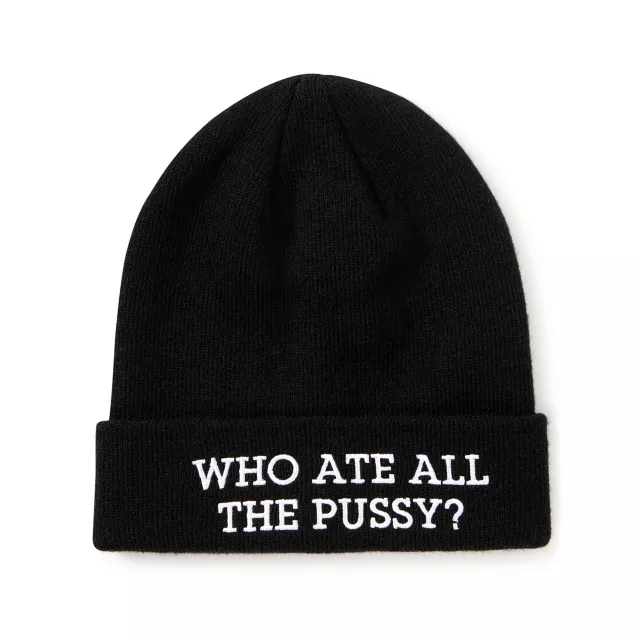 Make everyone laugh when you wear this Danny Duncan Who Ate All the Pussy? cuff beanie hat. This hilarious hat is just what you need to show off your sense of humor day or night.
