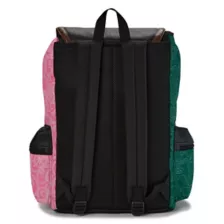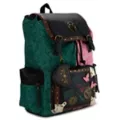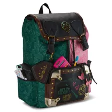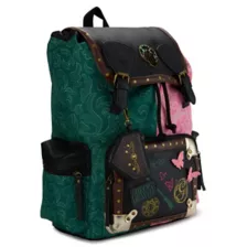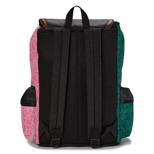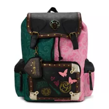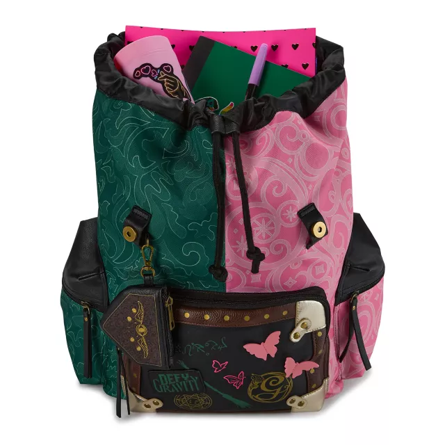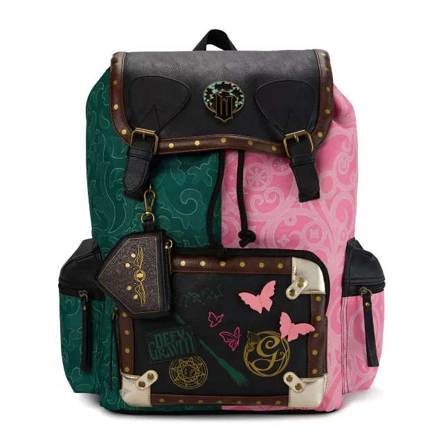 Pink? Green? Why not both? Celebrate the wonderful world of Wicked with this rucksack backpack! This rucksack features a spacious drawstring compartment with an internal laptop sleeve, a front zipper pocket adorned with graphics inspired by the contrasting personalities of Elphaba and Glinda, two secure side pockets, and a detachable coin pouch. A faux leather flap with a double snap closure makes this stunning bag easy to open and close. A metal "W" emblem, 3D butterfly appliques, and a "defy gravity" patch make this rucksack an instant fan favorite. When you wear it, you're gonna be popular!