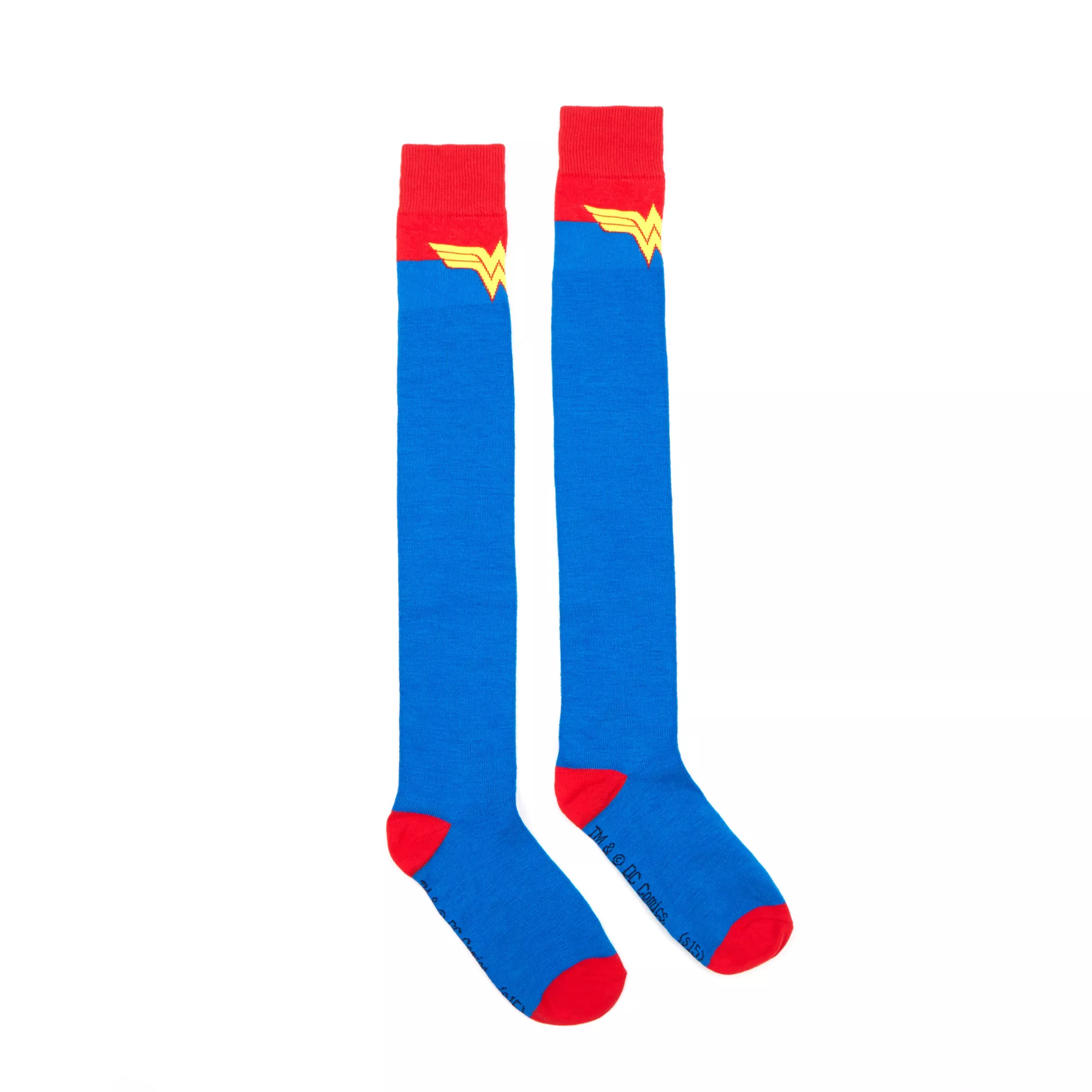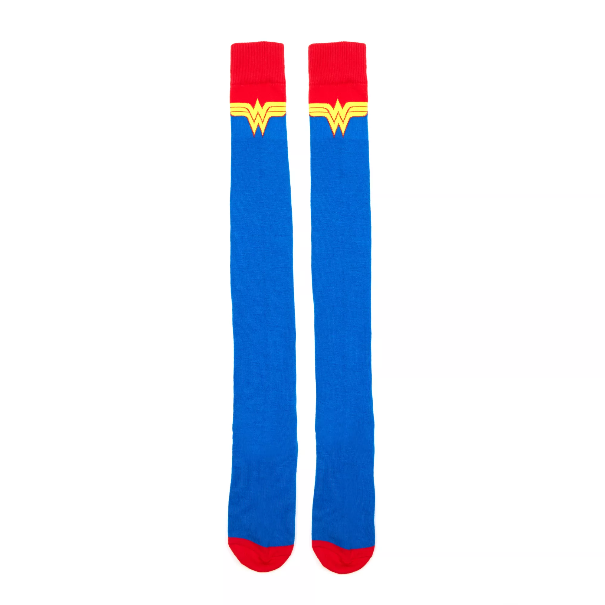 Rock the warrior princess herself by wearing these officially licensed Wonder Woman Over the Knee Socks on your feet! Embrace your inner super hero with these fun over-the-knee socks featuring Wonder Woman colors and emblem in gold at the top. Perfect accessory to a Wonder Woman costume (sold separately)!