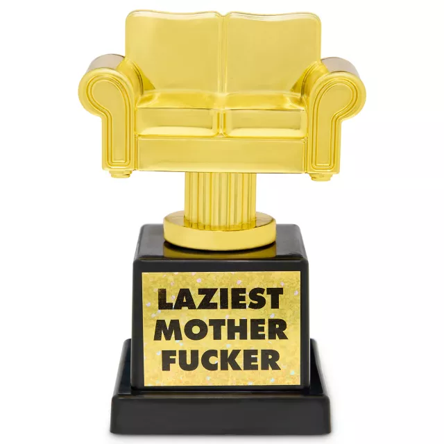 We all know that one person... Now you can finally reward their dedicated inactivity with the World's Laziest Mother Fucker Trophy. Crowned with a golden armchair and mounted on a glitzy pedestal, this trophy is the ultimate honor for the king or queen of the couch.