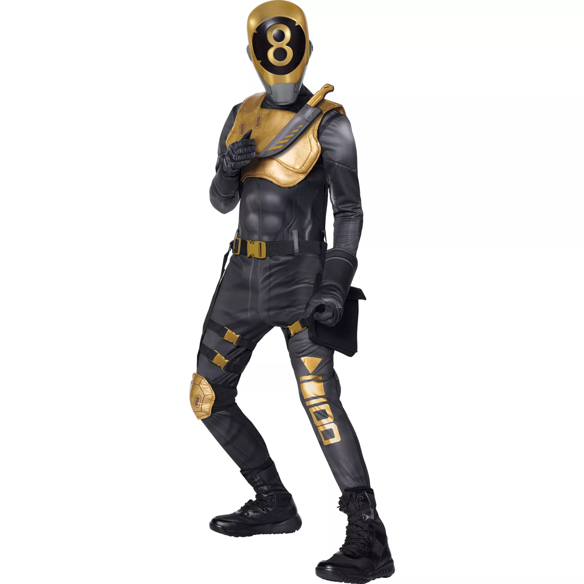 Take your 8-Ball Outfit to the next level this Halloween once you suit up in this officially licensed Fortnite 8-Ball (Gold) Costume. This golden 8-Ball Outfit will have you looking ready for any battle this Halloween. Featuring an awesome 8-Ball jumpsuit, chest armor, and a gold 8-Ball mask to start off your look, once you add the included accessories you'll be ready to stop anyone who rivals your squad this Halloween.